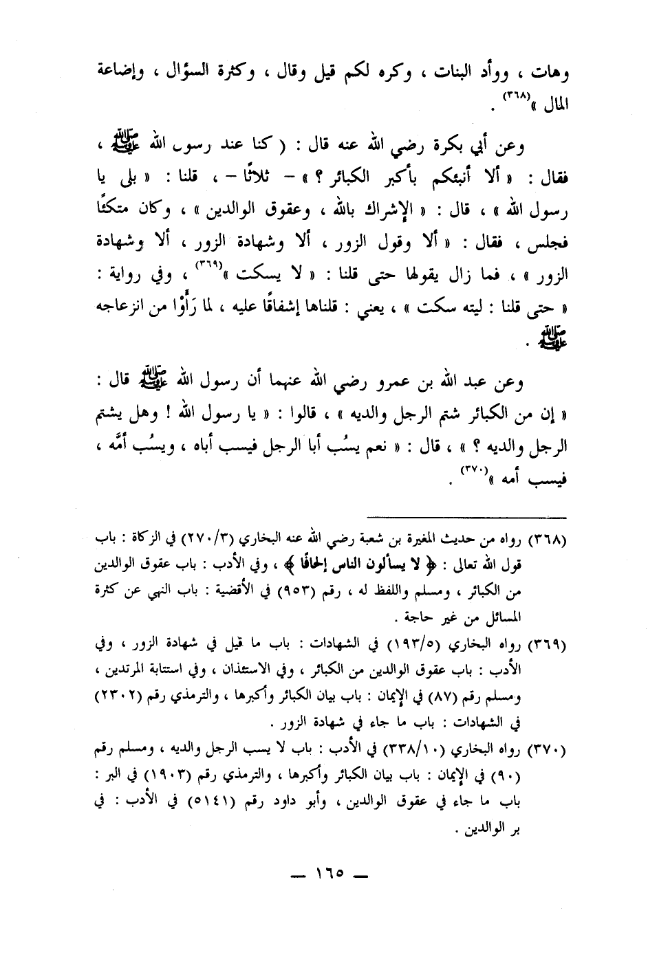 (369) رواه البخاري (5/193) في الشهادات: باب ما قيل في شهادة الزور، وفي الأدب: باب عقوق الوالدين من الكبائر، وفي الاستئذان، وفي استتابة المرتدين، ومسلم رقم (87) في الإيمان: باب بيان الكبائر وأكبرها، والترمذي رقم (2302) في الشهادات: باب ما جاء في شهادة الزور.