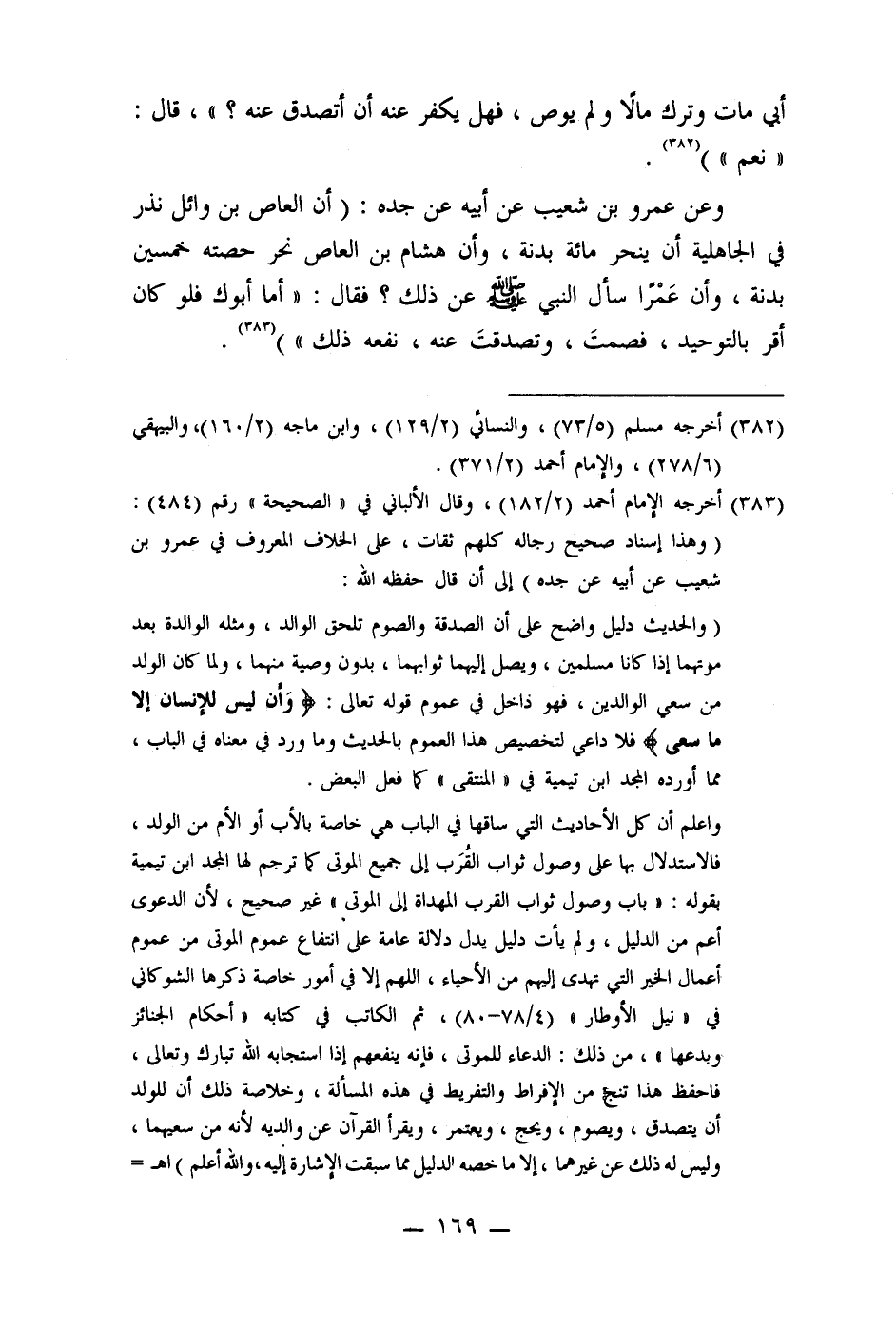 (383) أخرجه الإمام أحمد (2/182) ، وقال الألباني في الصحيحة، رقم (484) : (وهذا إسناد صحيح رجاله كلهم ثقات، على الخلاف المعروف في عمرر بن شعيب عن أبيه عن جده) إلى أن قال حفظه الله: