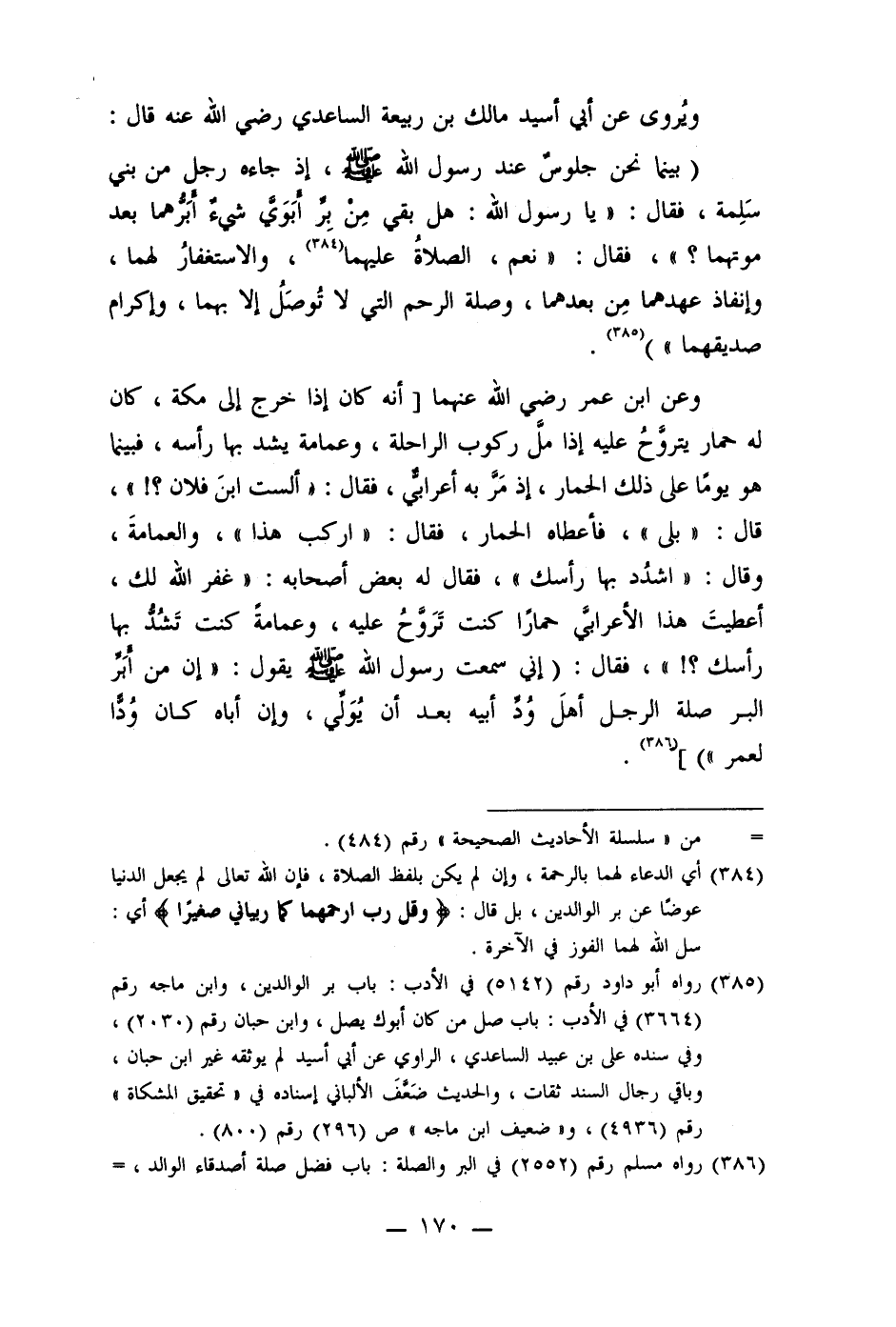 (385) رواه أبو داود رقم (5142) في الأدب: باب بر الوالدين، وابن ماجه رقم (3664) في الأدب: باب صل من كان أبوك يصل، وابن حبان رقم (2030) ، وفي سنده على بن عبيد الساعدي، الراوي عن أبي أسيد لم يوثقه غير ابن حبان، وباقي رجال السند ثقات، والحديث ضَعفَ الألباني إسناده في " تحقيق المشكاة، رقم (4936) ، و "ضعيف ابن ماجه " ص (296) رقم (800) .