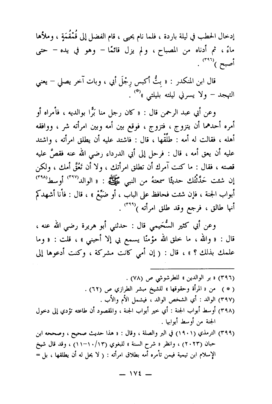(399) الترمذي (1901) في البر والصلة، وقال: " هذا حديث صحيح، وصححه ابن حبان (2023) ، وانظر " شرح السنة) للبغوي (13/10-11) ، وقد قال شيخ الإسلام ابن تيمية فيمن تأمره أمه بطلاق امرأته: " لا يحل له أن يطلقها، بل =