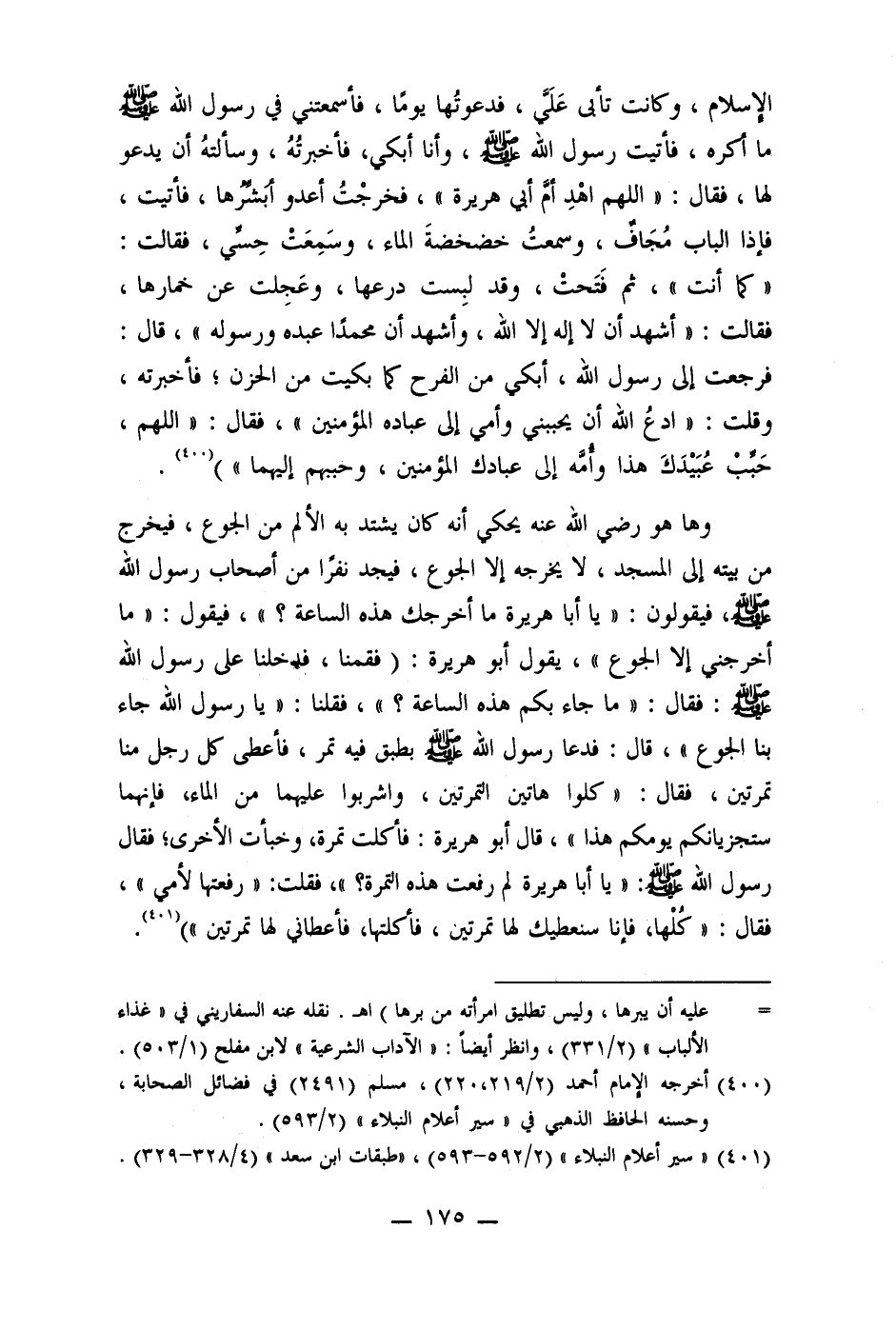الإسلام، وكانت تأبى عَلَي، فدعوتها يومًا، فأسمعتني في رسول الله صلى الله عليه وسلم ما أكره، فأتيت رسول الله صلى الله عليه وسلم، وأنا أبكى، فأخبرتُهُ، وسألتهُ أن يدعو لها، فقال: " اللهم اهْدِ أمً أبي هريرة "، فخرجْت أعدو أبشرها، فأتيت، فإذا الباب مُجَاف، وسمعتُ خضخضةَ الماء، وسَمِعَتْ حِسِّي، فقالت: "كما أنت"، ثم فتحتْ، وقد لبِست درعها، وعَجِلت عن خمارها، فقالت: " أشهد أن لا إله إلا الله، وأشهد أن محمدًا عبده ورسوله "، قال: فرجعت إلى رسول الله، أبكي من الفرح كما بكيت من الحزن؛ فأخبرته، وقلت: " ادعُ الله أن يحببني وأمي إلى عباده المؤمنين "، فقال: " اللهم، حَبِّبْ عُبَيْدَكَ هذا وأمه إلى عبادك المؤمنين، وحببهم إليهما " (400) .