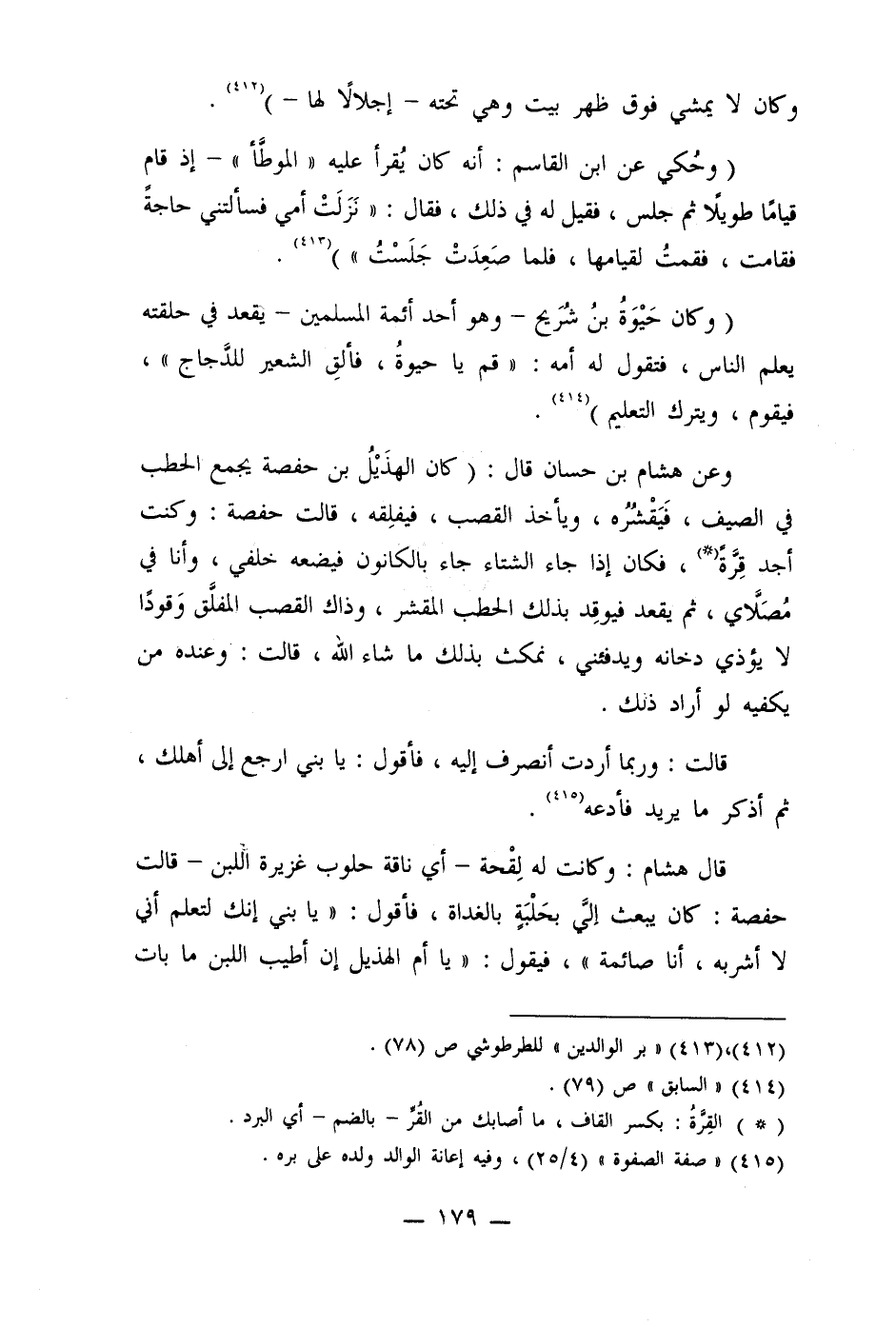 (وحُكي عن ابن القاسم: أنه كان يًقرأ عليه " الموطأ "- إذ قام قياما طويلًا ثم جلس، فقيل له في ذلك، فقال: " نَزَلَت أمي فسألتني حاجة فقامت، فقمتُ لقيامها، فلما صَعِدَتْ جَلَسْتُ ") (413) . (وكان حَيْوَةُ بنُ شُرَيح - وهو أحد أئمة المسلمين - يقعد في حلقته