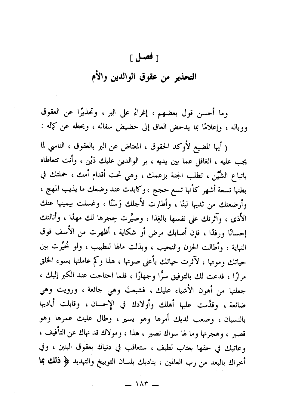 وما أحسن قول بعضهم، إغراءً على البر، وتحذيرًا عن العقوق ووباله، وإعلامَا بما يدحض العاق إلى حضيض سفاله، ويحطه عن كماله: (أيها المضيع لأوكد الحقوق، المعتاض عن البر بالعقوق، الناسي لما يجب عليه، الغافل عما بين يديه، بر الوالدين عليك دَين، وأنت تتعاطاه باتباع الشين، تطلب الجنة بزعمك، وهى تحت أقدام أمك، حملتك في بطنها تسعة أشهر كأنها تسع حجج، وكابدت عند وضعك ما يذيب المهج، وأرضعتك من ثديها لبنًا، وأطارت لأجلك وَسَنًا، وغسلت بيمينها عنك الأذى، وآثرتك على نفسها بالغِذا، وصيَّرت حِجرها لك مهدا، وأنالتك إحسانا ورفدا، فإن أصابك مرض أو شكاية، أظهرت من الأسف فوق النهاية، وأطالت الحزن والنحيب، وبذلت مالها للطبيب، ولو خُيِّرت بين حياتك وموتها، لآثرت حياتك بأعلى صوتها، هذا وكم عاملتها بسوء الخلق مرارًا، فدعت لك بالتوفيق سرا وجهارا، فلما احتاجت عند الكبر إليك، جعلتها من أهون الأشياء عليك، فشبعتَ وهى جائعة، ورويت وهي ضائعة، وقدمت عليها أهلك وأولادك في الإحسان، وقابلت أياديها بالنسيان، وصعب لديك أمرها وهو يسير، وطال عليك عمرها وهو قصير، وهجرتها وما لها سواك نصير، هذا، ومولاك قد نهاك عن التأفيف، وعاتبك في حقها بعتاب لطيف، ستعاقب في دنياك بعقوق البنين، وفي أخراك بالبعد من رب العالمين، يناديك بلسان التوبيخ والتهديد (ذلك بما