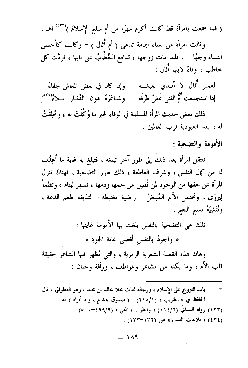 تنتقل المرأة بعد ذلك إلى طور آخر تبلغه، فتبلغ به غاية ما أعدَّت له من كمال النفس، وشرف العاطفة، ذلك طور التضحية، فهناك تنزل المرأة عن حقها من الوجود لمن فُصِل عن لحمها ودمها، تسهر لينام، وتظمأ لِيروى، وتحتمل الألم المُمِضَّ- راضية مغتبطة - لتذيقه طعم الدعة، وتُنْشِيَهُ نسيم النعيم.