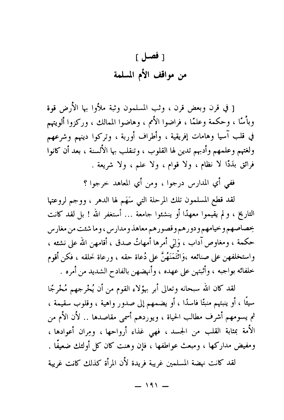 لقد قطع المسلمون تلك المرحلة التي سهم لها الدهر ووجم لروعتها التاريخ ولم يقيموا معهدا أو ينشئوا جامعة ... استغفر الله! بل لقد كانت خصاصهم وخيامهم ودورهم وقصورهم معاهد ومدارس وما شئت من مغارس حكمة ومغاوص آداب ولي أمرها أمهات صدق أقامهن الله على نشئه واستخلفهن على صنائعه وَائْتَمَنَهُنَّ على دعاة حقه ورعاة خلقه فكن أقوم خلفائه بواجبه وأثبتهن على عهده وأنهضهن بالفادح الشديد من أمره لقد كان الله سبحانه وتعالى أبر بهؤلاء القوم من أن يخرجهم مخرجا سيئا أو ينبتهم منبتا فاسدا أو يضمهم إلى صدور واهية وقلوب سقيمة ثم يسومهم أشرف مطالب الحياة ويوردهم أسمى مقاصدها.. لأن الأم من الأمة بمثابة القلب من الجسد فهي غذاء أرواحهم ومران أعوادهم ومفيض مداركهم ومبعث عواطفهم فإن وهنت كان كل أولائك ضعيفا لقد كانت نهضة المسلمين غريبة فريدة لأن المرأة كذلك كانت غريبة