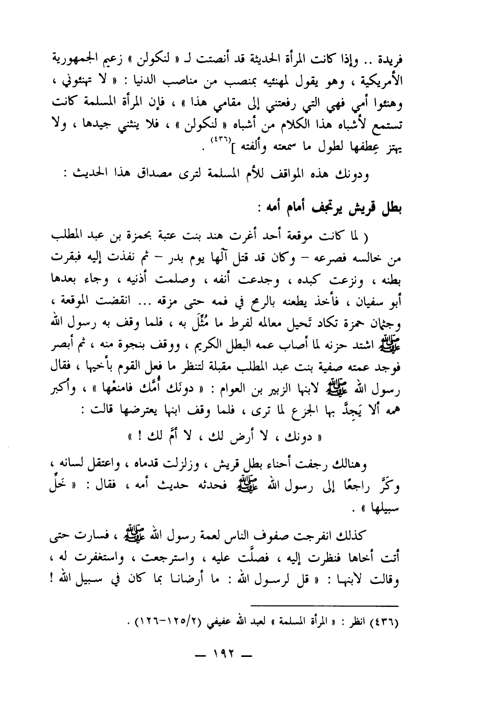 فريدة.. وإذا كانت المرأة الحديثة قد أنصتت لـ " لنكولن " زعيم الجمهورية الأمريكية، وهو يقول لمهنئيه بمنصب من مناصب الدنيا: " لا تهنئوني، وهنئوا أمي فهي التي رفعتني إلى مقامي هذا "، فإن المرأة المسلمة كانت تستمع لأشباه هذا الكلام من أشباه " لنكولن "، فلا ينثني جيدها، ولا يهتز عِطفها لطول ما سمعته وألفته] (436) .