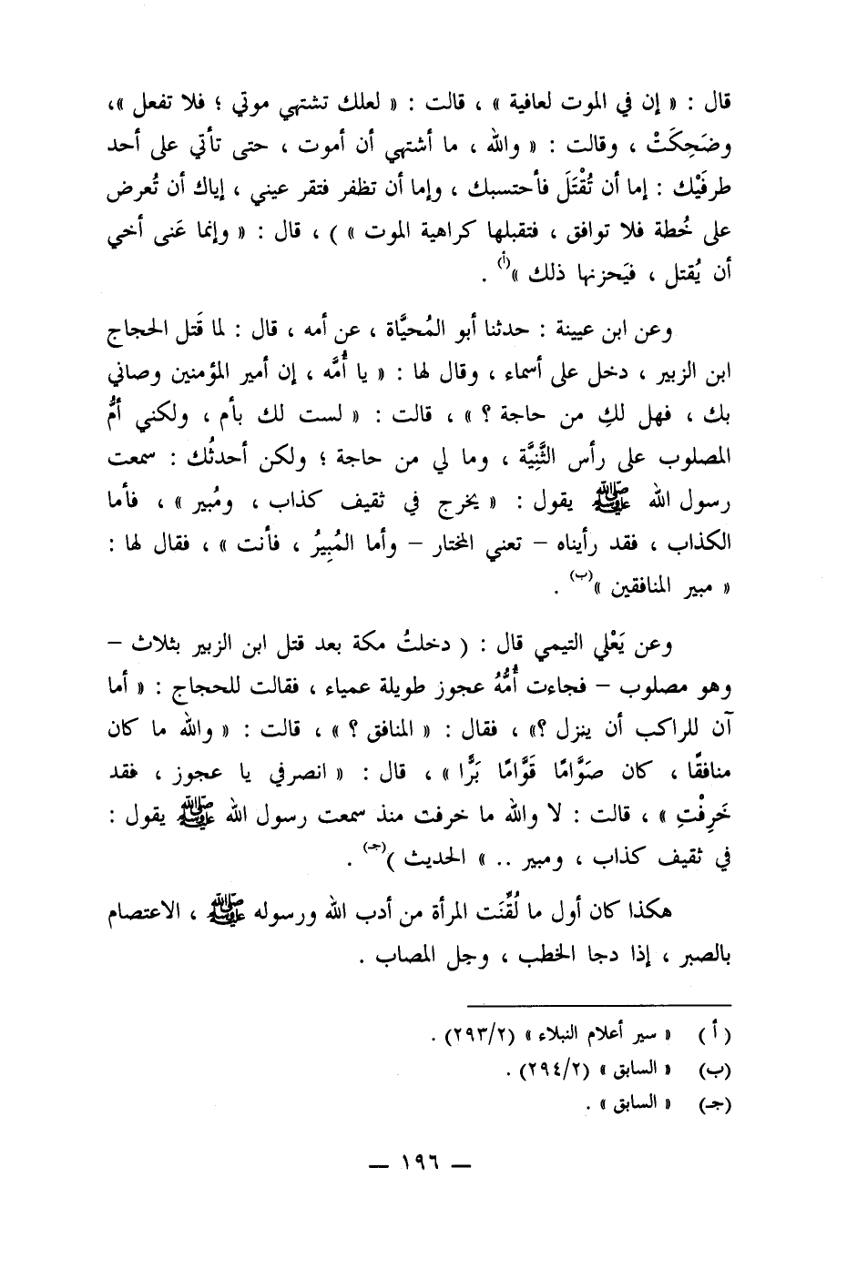 وعن يَعْلي التيمي قال: (دخلتُ مكة بعد قتل ابن الزبير بثلاث - وهو مصلوب- فجاءت أمُّهُ عجوز طويلة عمياء، فقالت للحجاج: " أما آن للراكب اًن ينزل؟ "، فقال: " المنافق؟ "، قالت: " والله ما كان منافقَا، كان صَواما قَوامًا بَرُّا "، قال: " انصرفي يا عجوز، فقد خَرِفْتِ "، قالت: لا والله ما خرفت منذ سمعت رسول الله صلى الله عليه وسلم يقول: في ثقيف كذاب، ومبير ... " الحديث (ج) .