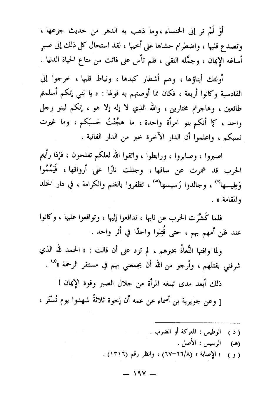 أوَ لَم تر إلى الخنساء، وما ذهب به الدهر من حديث جزعها، وتصدع قلبها، واضطرام حشاها على أخيها، لقد استحال كل ذلك إلى صبر أساغه الإيمان، وجمله التقى، فلم تأس على فائت من متاع الحياة الدنيا. أولئك أبناؤها، وهم أشطار كبدها، ونياط قلبها، خرجوا إلى القادسية وكانوا أربعة، فكان مما أوصتهم به قولها: " يا بَني إنكم أسلمتم طائعين، وهاجرتمَ مختارين، والله الذي لا إله إلا هو، إنكم لبنو رجل واحد، كما أنكم بنو امرأة واحدة، ما هجنْتُ حَسبَكم، وما غيرت نسبكم، واعلموا أن الدار الآخرة خير من الدار الفانية.