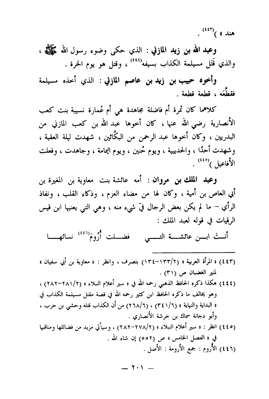 وعبد الله بن زيد المازني: الذي حكى وضوء رسول الله صلى الله عليه وسلم، والذي قتَل مسيلمة الكذاب بسيفه (444) ، وقتل هو يوم الحرة.