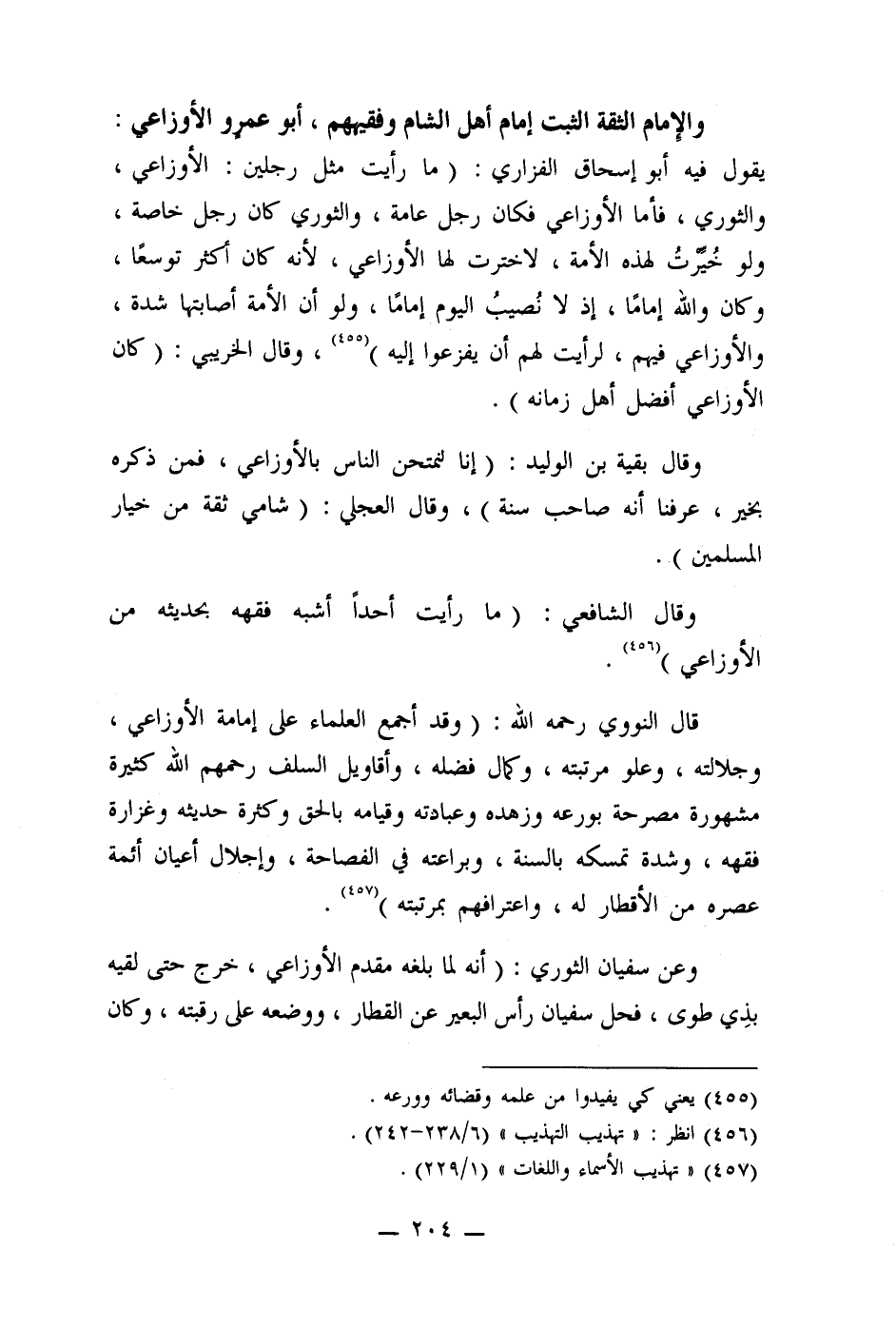 والإمام الثقة الثبت إمام أهل الشام وفقيههم، أبو عمرو الأوزاعي: يقول فيه أبو إسحاق الفزاري: (ما رأيت مثل رجلين: الأوزاعي، والثوري، فأما الأوزاعي فكان رجل عامة، والثوري كان رجل خاصة، ولو خُيرتُ لهذه الأمة، لاخترت لها الأوزاعي، لأنه كان أكثر توسعًا، وكان والله إمامًا، إذ لا نصيبُ اليوم إمامًا، ولو أن الأمة أصابتها شدة، والأوزاعي فيهم لرأيت لهم أن يفزعوا إليه) (455) ، وقال الخريبي: (كان الأوزاعي أفضل أهل زمانه) .