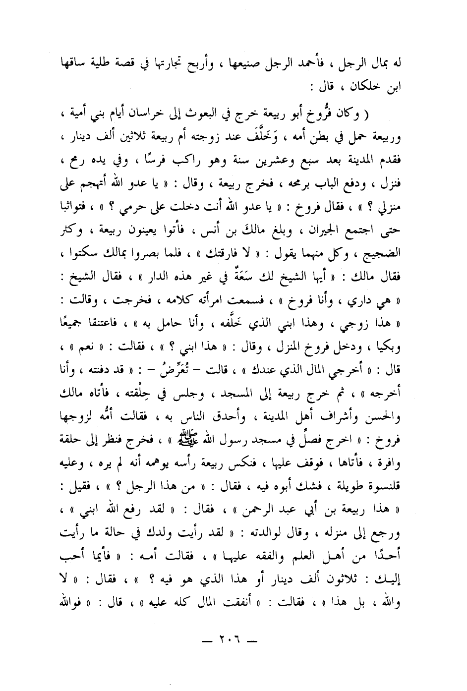 (وكان فرُّوخ أبو ربيعة خرج في البعوث إلى خراسان أيام بنى أمية، وربيعة حمل في بطن أمه، وَخَلَّفَ عند زوجته أم ربيعة ثلاثين ألف دينار، فقدم المدينة بعد سبع وعشرين سنة وهو راكب فرسا، وفي يده رمح، فنزل، ودفع الباب برمحه، فخرج ربيعة، وقال: " يا عدو الله أتهجم على منزلي؟ "، فقال فروخ: (يا عدو الله أنت دخلت على حرمي؟ "، فتواثبا حتى اجتمع الجيران، وبلغ مالكَ بن أنس، فأتوا يعينون ربيعة، وكثر الضجيج، وكل منهما يقول: " لا فارقتك"، فلما بصروا بمالك سكتوا، فقال مالك: (أيها الشيخ لك سَعَة في غير هذه الدار "، فقال الشيخ: " هي داري، وأنا فروخ "، فسمعت امرأته كلامه، فخرجت، وقالت: " هذا زوجي، وهذا ابنى الذي خَلَّفه، وأنا حامل به "، فاعتنقا جميعا وبكيا، ودخل فروخ المنزل، وقال: " هذا ابني؟ "، فقالت: " نعم "، قال: " أخرجي المال الذي عندك "، قالت- تُعَرضُ -: " قد دفنته، وأنا أخرجه "، ثم خرج ربيعة إلى المسجد، وجلس في حِلْقته، فأتاه مالك والحسن وأشراف أهل المدينة، وأحدق الناس به، فقالت أمُه لزوجها فروخ: (اخرج فصل في مسجد رسول الله صلى الله عليه وسلم "، فخرج فنظر إلى حلقة وافرة، فأتاها، فوقف عليها، فنكس ربيعة رأسه يوهمه أنه لم يره، وعليه قلنسوة طويلة، فشك أبوه فيه، فقال: " من هذا الرجل؟ "، فقيل: " هذا ربيعة بن أبي عبد الرحمن "، فقال: " لقد رفع الله ابني "، ورجع إلى منزله، قال لوالدته: " لقد رأيت ولدك في حالة ما رأيت أحدًا من أهل العلم والفقه عليها "، فقالت أمه: " فأيما أحب إليك: ثلاثون ألف دينار أو هذا الذي هو فيه؟ "، فقال: " لا والله، بل هذا "، فقالت: " أنفقت المال كله عليه "، قال: " فوالله