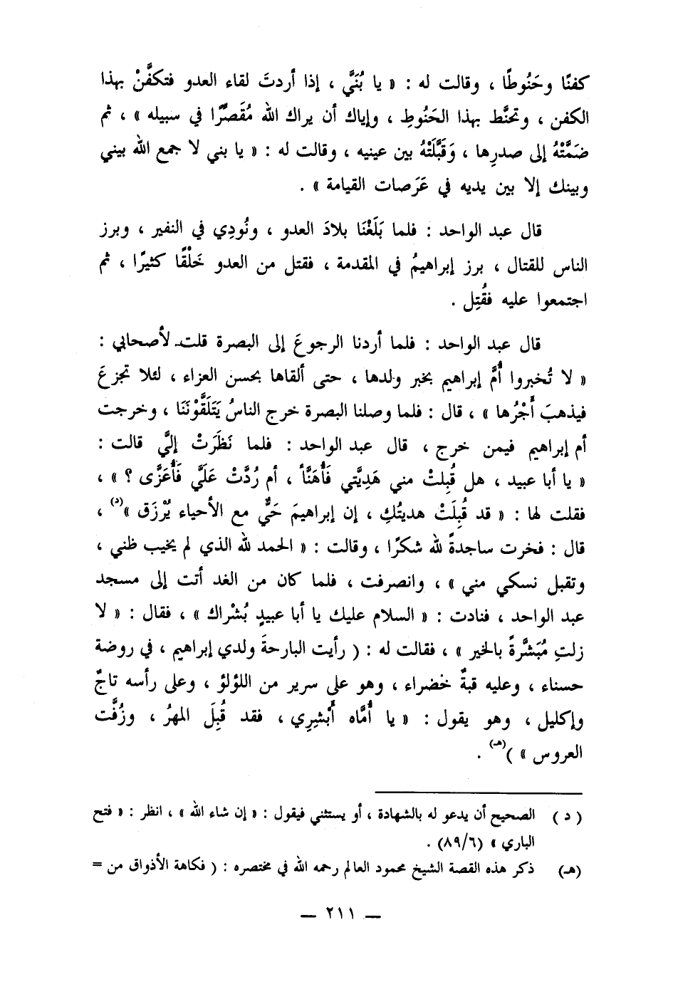 كفنًا وحَنُوطًا، وقالت له: " يا بُنَيَّ، إذا أردتَ لقاء العدو فتكفنْ بهذا الكفن، وتحنط بهذا الحَنُوطِ، وإياك أن يراك الله مُقَصرا في سبيله "، ثم ضَمَّتهُ إلى صدرِها، وَقَبلَتْهُ بين عينيه، وقالت له: " يا بني لا جمع الله بيني وبينك إلا بين يديه في عَرَصات القيامة ".