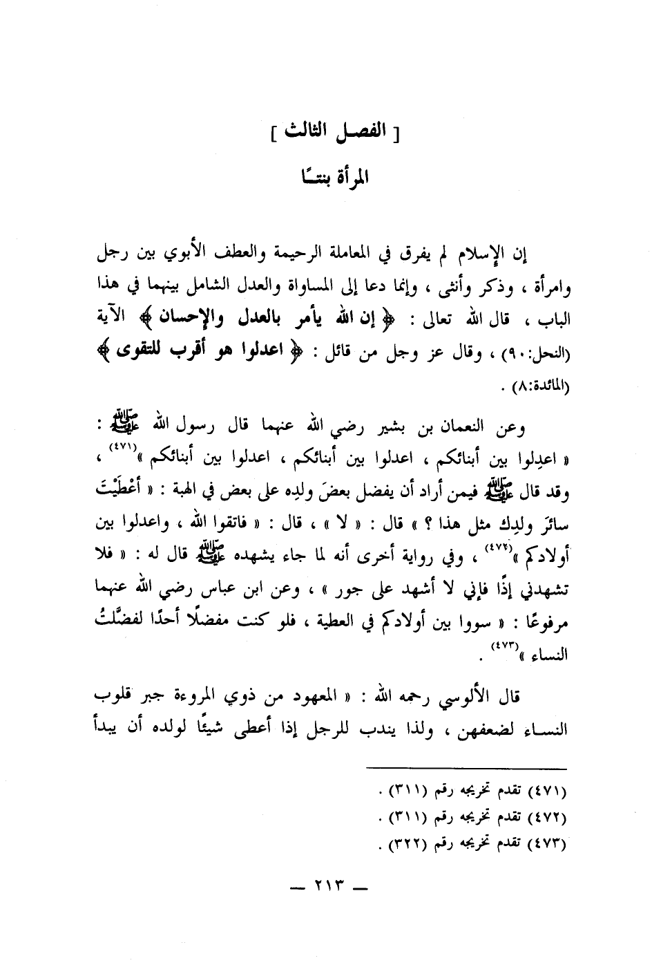 إن الإسلام لم يفرق في المعاملة الرحيمة والعطف الأبوي بين رجل وامرأة، وذكر وأنثى، وإنما دعا إلى المساواة والعدل الشامل بينهما في هذا الباب، قال الله تعالى: (إن الله يأمر بالعدل والإحسان) الآية (النحل: 90) ، وقال عز وجل من قائل: (اعدوا هو أقرب التقوى) (المائدة: 8)