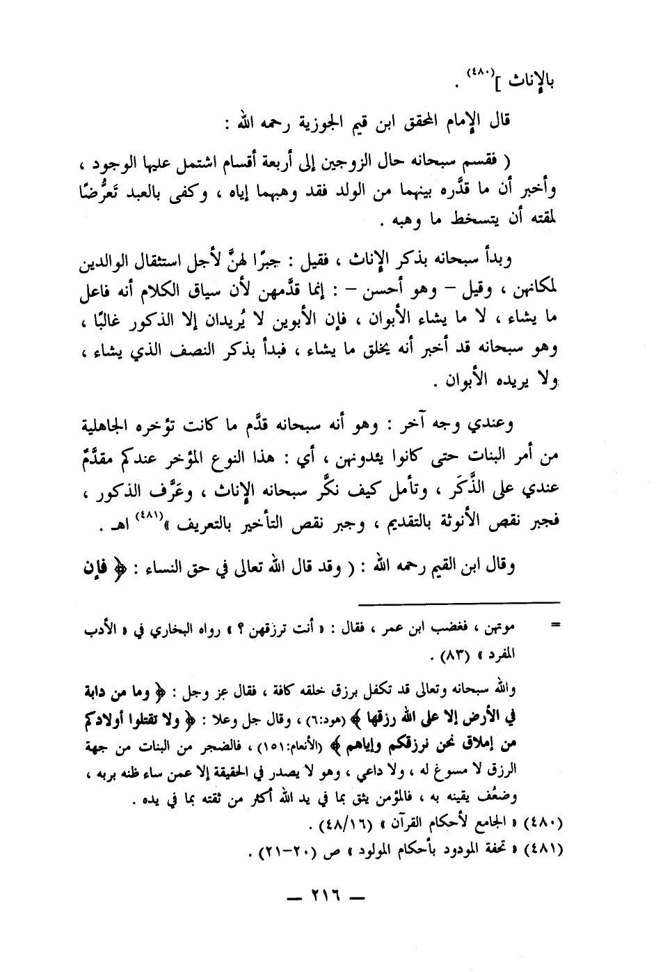 وقال ابن القيم رحمه الله: (وقد قال الله تعالى في حق النساء: (فإن