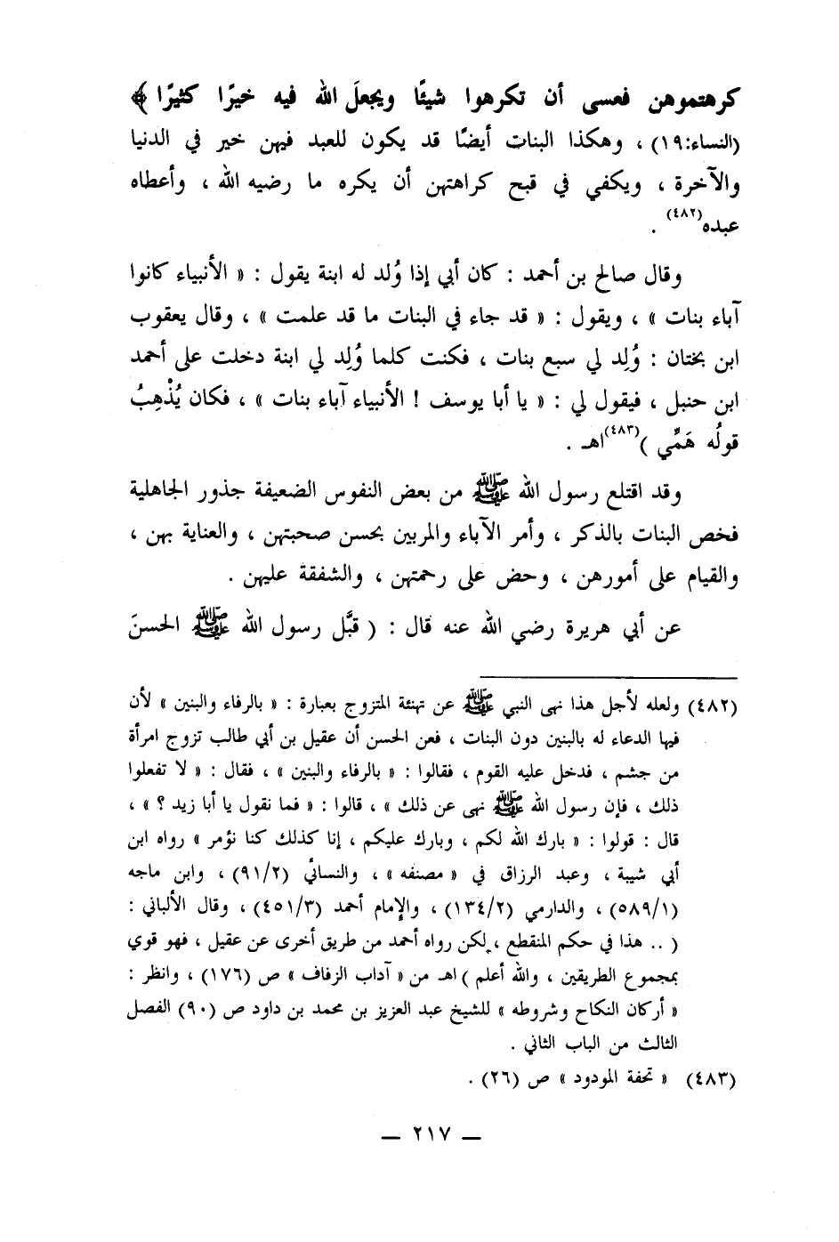كرهتموهن فعسى أن تكرهوا شيئًا ويجعلَ الله فيه خيرًا كثيرا) (النساء: 19) ، وهكذا البنات أيضًا قد يكون للعبد فيهن خير في الدنيا والآخرة، ويكفي في قبح كراهتهن أن يكره ما رضيه الله، وأعطاه عبده (482) .
