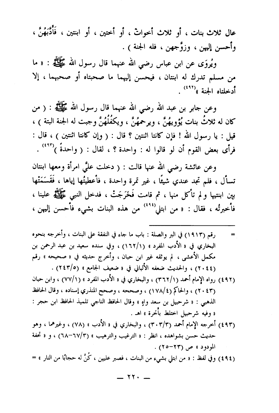 وعن جابر بن عبد الله رضي الله عنهما قال رسول الله صلى الله عليه وسلم: (من كان له ثلاثُ بنات يُؤويهُن، ويرحمهُنَّ، ويكفلُهُنَّ وجبت له الجنة البتة) ، قيل: يا رسول الله! فإن كانتا اثنتين؟ قال: (وإن كانتا اثنتين) ، قال: فرأى بعض القوم أن لو قالوا له: واحدة؟ ، لقال: (واحدةً) (493) .