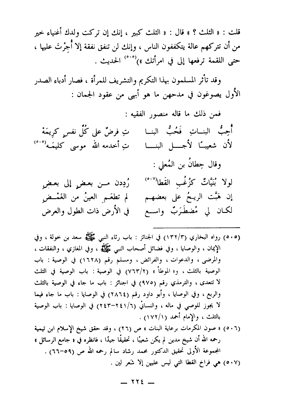قلت: " الثلث؟ " قال: " الثلث كبير، إنك إن تركت ولدك أغنياء خير من أن تتركهم عالة يتكففون الناس، وإنك لن تنفق نفقهّ إلا أجرْتَ عليها، حتى اللقمة ترفعها إلى في امرأتك ") (505) الحديث.