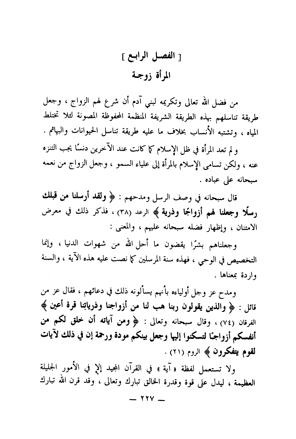 ولم تعد المرأة في ظل الإسلام كما كانت عند الآخرين دنسًا يجب التنَزه عنه، ولكن تسامى الإسلام بالمرأة إلى علياء السمو، وجعل الزواج من نعمه سبحانه على عباده.