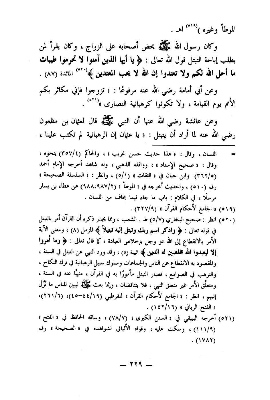 (520) انظر: صحيح البخاري (7/5) ط. الشعب، ومما يجدر ذكره أن القرآن أمر بالتبتل في قوله تعالى: (واذكر اسم ربك وتبتل إليه تبتيلا) المزمل (8) ، ومعنى الآية الأمر بالانقطاع إلى الله عز وجل بإخلاص العبادة، كما قال تعالى: (وما أمروا إلا ليعبدوا الله مخلصين له الدين) البينة (5) ، وقد ورد النهي عن التبتل في السنة، والمقصود به الانقطاع عن الناس والجماعات وسلوك سبيل الرهبانية في ترك النكاح، والترهب في الصوامع، فصار التبتل مأمورا به في القرآن، منهيا عنه في السنة، ومتعلق الأمر غير متعلق النهي، فلا يتناقضان، وإنما بعث صلى الله عليه وسلم ليبين للناس ما نُزل إليهم، انظر: " الجامع لأحكام القرآن " للقرطبي (19/ 44-45) ، (6/261) ، " الفتح الرباني" (16/142) .