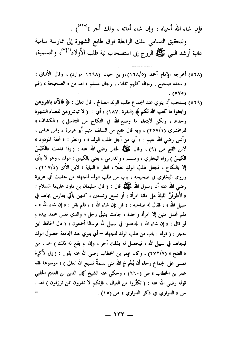 ولتحقيق التسامي بتلك الرابطة فوق طابع الشهوة إلى ممارسة سامية عالية أرشد النبي صلى الله عليه وسلم الزوج إلى استصحاب نية طلب الأولاد (529) ، والتسمية،