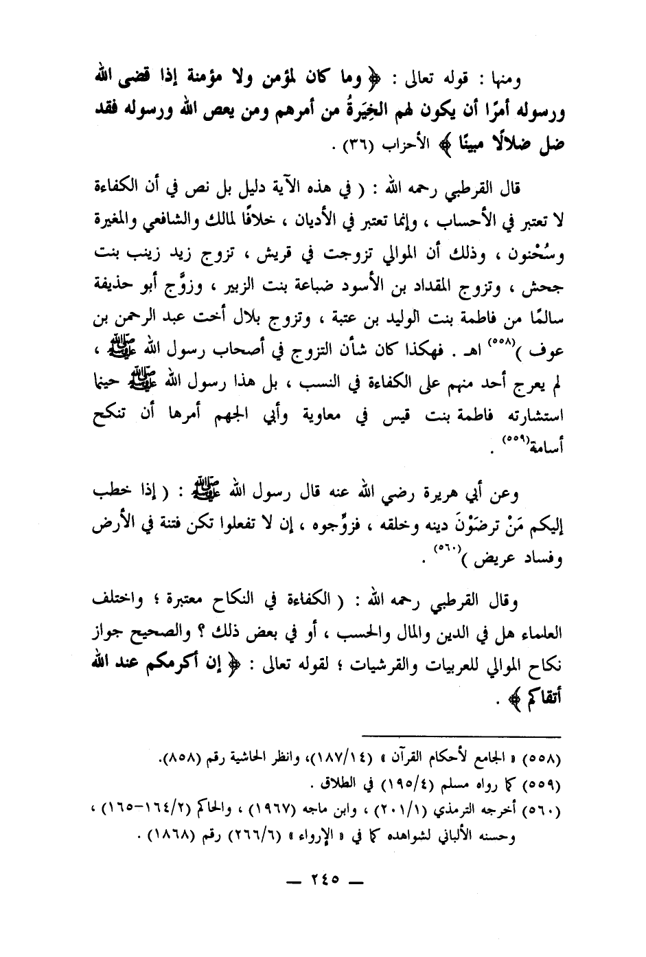 قال القرطبي رحمه الله: (في هذه الآية دليل بل نص في أن الكفاءة لا تعتبر في الأحساب، وإنما تعتبر في الأديان، خلافًا لمالك والشافعي والمغيرة وسحْنون، وذلك أن الموالي تزوجت في قريش، تزوج زيد زينب بنت جحش، وتزوج المقداد بن الأسود ضباعة بنت الزبير، وزوج أبو حذيفة سالمًا من فاطمة بنت الوليد بن عتبة، وتزوج بلال أخت عبد الرحمن بن عوف) (558) اهـ. فهكذا كان شأن التزوج في أصحاب رسول الله صلى الله عليه وسلم، لم يعرج أحد منهم على الكفاءة في النسب، بل هذا رسول الله صلى الله عليه وسلم حينما استشارته فاطمة بنت قيس في معاوية وأبي الجهم أمرها أن تنكح أسامة (559) .