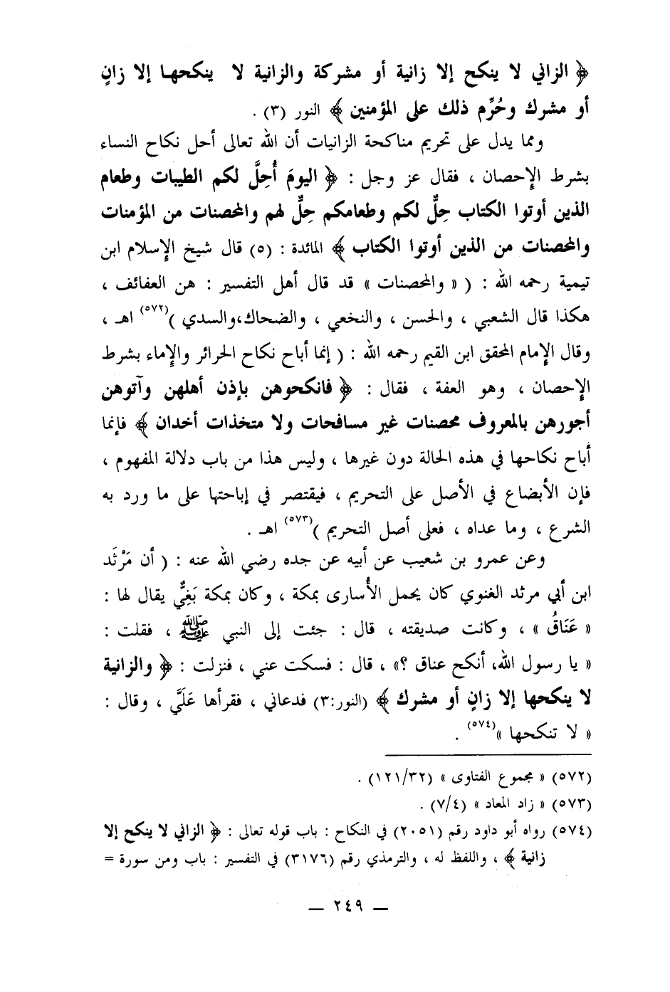 وعن عمرو بن شعيب عن أبيه عن جده رضي الله عنه: (أن مَرْثَد ابن أبي مرثد الغنوي كان يحمل الأسارى بمكة، وكان بمكة بَغيٌّ يقال لها: " عَنَاق " وكانت صديقته، قال: جئت إلى النبي صلى الله عليه وسلم، فقلت: " يا رسول الله، أنكح عناق؟ "، قال: فسكت عني، فنزلت: (والزانية لا ينكحها إلا زان أو مشرك) (النور: 3) فدعاني، فقرأها عَلَيَّ، وقال: " لا تنكحها " (574) .