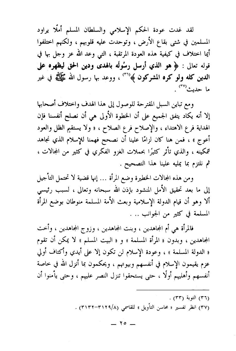 ومن هذه المجالات الخطيرة وضع المرأة ... إنها قضية لا تحتمل التأجيل إلى ما بعد تحقيق الأمل المنشود بإذن الله سبحانه وتعالى، لسبب رئيسي ألا وهو أن قيام الدولة الإسلامية وبعث الأمة المسلمة منوطان بوضع المرأة المسلمة في كثير من الجوانب. . .