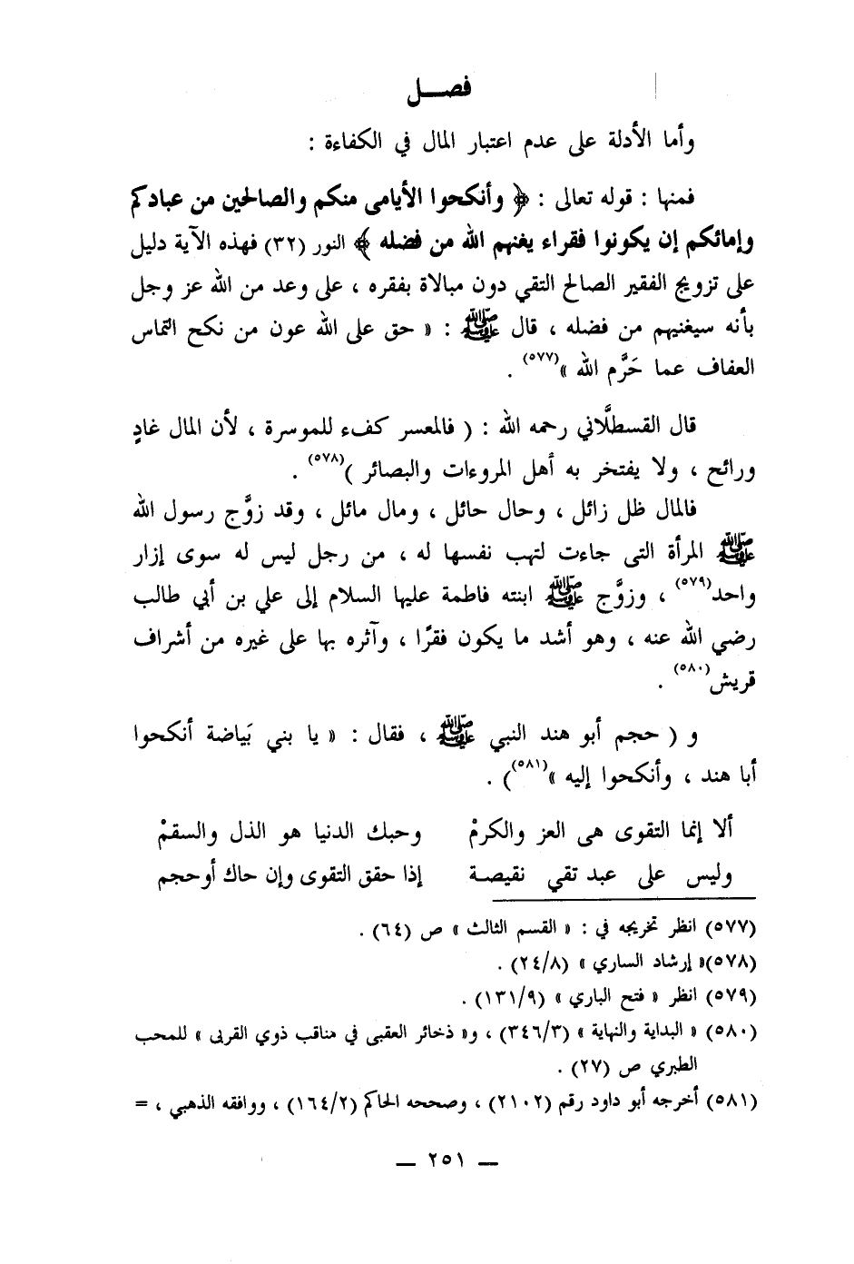 فالمال ظل زائل، وحال حائل، ومال مائل، وقد زوج رسول الله صلى الله عليه وسلم المرأة التي جاءت لتهب نفسها له، من رجل ليس له سوى إزار واحد (579) ، وزوَّج صلى الله عليه وسلم ابنته فاطمة عليها السلام إلى علي بن أبي طالب رضي الله عنه، وهو أشد ما يكون فقرا، وآثره بها على غيره من أشراف قريش (580) .