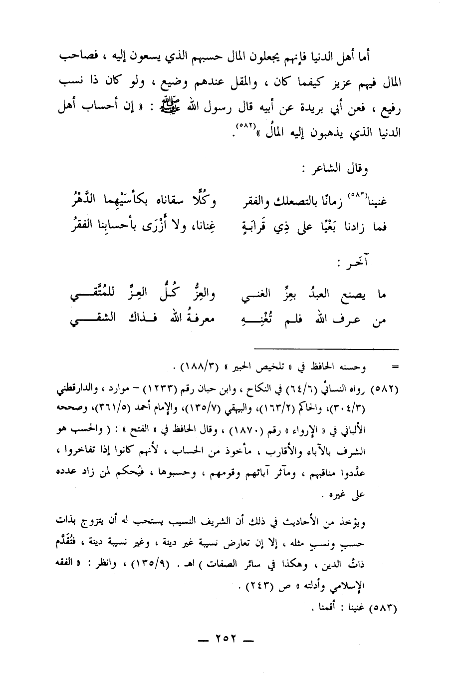 (582) رواه النسائي (6/64) في النكاح، وابن حبان رقم (1233) - موارد، والدارقطني (3/304) ، والحاكم (2/163) ، والبيهقي (7/135) ، والإمام أحمد (5/361) ، وصححه الألباني في " الإرواء" رقم (1870) ، وقال الحافظ في "الفتح": (والحسب هو الشرف بالآباء والأقارب، مأخوذ من الحساب، لأنهم كانوا إذا تفاخروا، عددوا مناقبهم، ومآثر آبائهم وقومهم، وحسبوها، فيُحكم لمن زاد عدده على غيره.