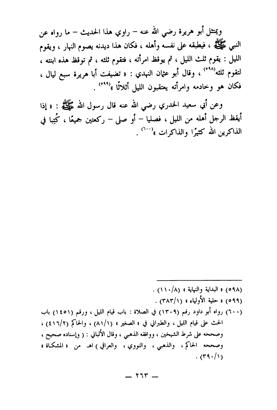 ويمتثل أبو هريرة رضي الله عنه- راوي هذا الحديث- ما رواه عن النبي صلى الله عليه وسلم:، فيطبقه على نفسه وأهله، فكان هذا ديدنه يصوم النهار، ويقوم الليل: يقوم ثلث الليل، ثم يوقظ امرأته، فتقوم ثلثه، ثم توقظ هذه ابنته، لتقوم ثلثه (598) ، وقال أبو عثمان النهدي: (تضيفت أبا هريرة سبع ليال، فكان هو وخادمه وامرأته يعتقبون الليل أثلاًثا " (599) .