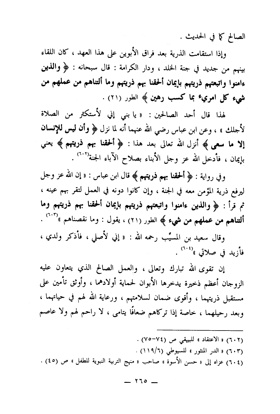 لهذا قال أحد الصالحين: " يا بني إني لأستكثر من الصلاة لأجلك"، وعن ابن عباس رضي الله عنهما أنه لما نزل (وأن ليس للإنسان إلا ما سعى أنزل الله تعالى بعد هذا: (ألحقنا بهم ذريتهم) يعني بإيمان، فأدخل الله عز وجل الأبناء بصلاح الآباء الجنة (602) .