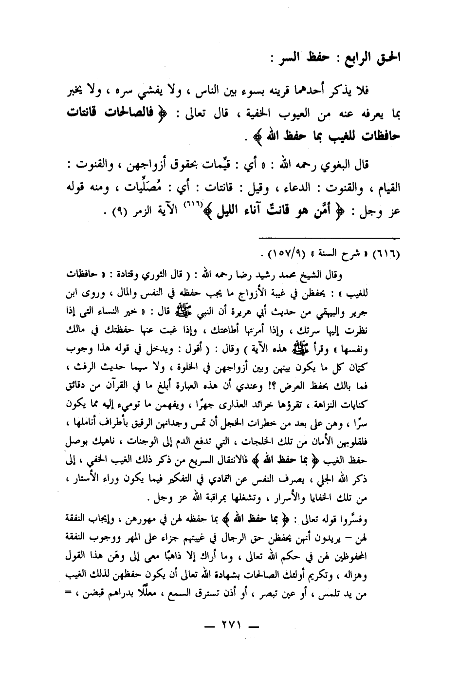 وقال الشيخ محمد رشيد رضا رحمه الله: (قال الثوري وقتادة: " حافظات للغيب ": يحفظن في غيبة الأزواج ما يجب حفظه في النفس والمال، وروى ابن جرير والبيهقي من حديث أبي هريرة أن النبي صلى الله عليه وسلم قال: " خير النساء التي إذا نظرت إليها سرتك، وإذا أمرتهما أطاعتك، وإذا غبت عنها حفظتك في مالك ونفسها " وقرأ صلى الله عليه وسلم هذه الآية) وقال: (أقول: ويدخل في قوله هذا وجوب كتمان كل ما يكون بينهن وبين أزواجهن في الخلوة، ولا سيما حديث الرفث، فما بالك بحفظ العرض؟ ! وعندي أن هذه العبارة أبلغ ما في القرآن من دقائق كنايات النزاهة، تقرؤها خرائد العذارى جهرا، ويفهمن ما تومئ إليه مما يكون سرا، وهن على بعد من خطرات الخجل أن تمس وجدانهن الرقيق بأطراف أناملها، فلقلوبهن الأمان من تلك الخلجات، التي تدفع الدم إلى الوجنات، ناهيك بوصل حفظ الغيب (بما حفظ الله) فالانتقال السريع من ذكر ذلك الغيب الخفي، إلى ذكر الله الجلي، يصرف النفس عن التمادي في التفكير فيما يكون وراء الأستار، من تلك الخفايا والأسرار، وتشغلها بمراقبة الله عز وجل.