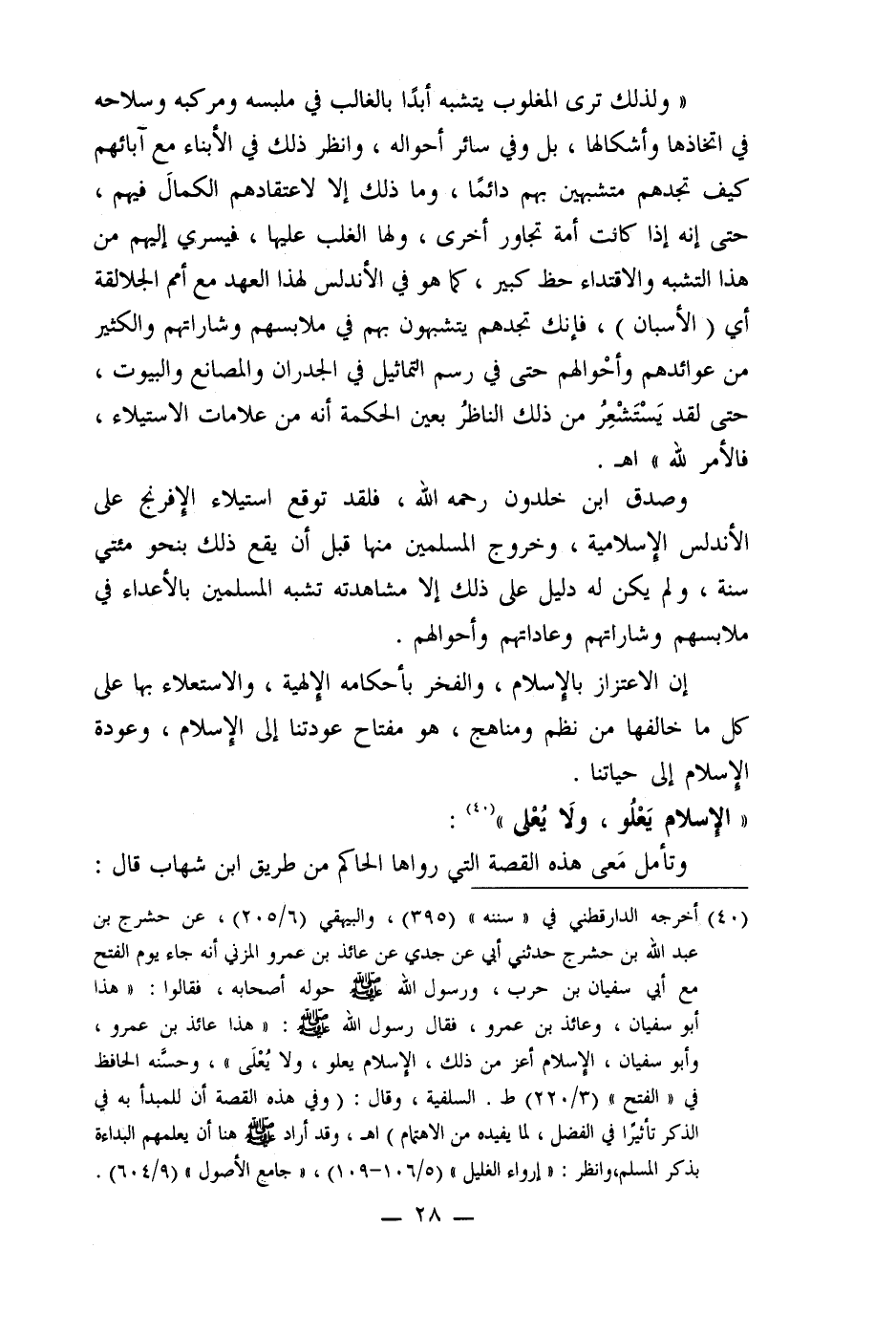 " ولذلك ترى المغلوب يتشبه أبدًا بالغالب في ملبسه ومركبه وسلاحه في اتخاذها وأشكالها، بل وفي سائر أحواله، وانظر ذلك في الأبناء مع آبائهم كيف تجدهم متشبهين بهم دائما، وما ذلك إلا لاعتقادهم الكمالَ فيهم، حتى إنه إذا كانت أمة تجاور أخرى، ولها الغلب عليها، فيسرى إليهم من هذا التشبه والاقتداء حظ كبير، كما هو في الأندلس لهذا العهد مع أمم الجلالقة أي (الأسبان) ، فإنك تجدهم يتشبهون بهم في ملابسهم وشاراتهم والكثير من عوائدهم وأحْوالهم حتى في رسم التماثيل في الجدران والمصانع والبيوت، حتى لقد يَسْتَشْعِر من ذلك الناظرُ بعين الحكمة أنه من علامات الاستيلاء، فالأمر لله" اهـ.