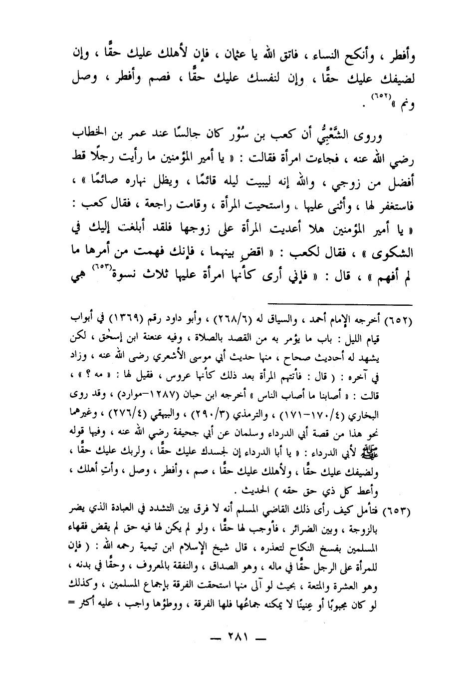 (652) أخرجه الإمام أحمد، والسياق له (6/268) ، وأبو داود رقم (1369) في أبواب قيام الليل: باب ما يؤمر به من القصد بالصلاة، وفيه عنعنة ابن إسحق، لكن يشهد له أحاديث صحاح، فها حديث أبي موسى الأشعري رضي الله عنه، وزاد في آخره: (قال: فأتتهم المرأة بعد ذلك كأنها عروس، فقيل لها: " مه؟ "، قالت: " أصابنا ما أصاب الناس" أخرجه ابن حبان (1287- موارد) ، وقد روى البخاري (4/170- 171) ، والترمذي (3/290) ، والبيهقي (4/276) ، وغيرهما نحو هذا من قصة أو الدرداء وسلمان عن أبي جحيفة رضي الله عنه، وفيها قوله صلى الله عليه وسلم لأبي الدرداء: " يا أبا الدرداء إن لجسدك عليك حقا، ولربك عليك حقا، ولضيفك عليك حقا، ولأهلك عليك حقا، صم، وأفطر، وصل، وأتِ أهلك، وأعط كل ذي حق حقه) الحديث.