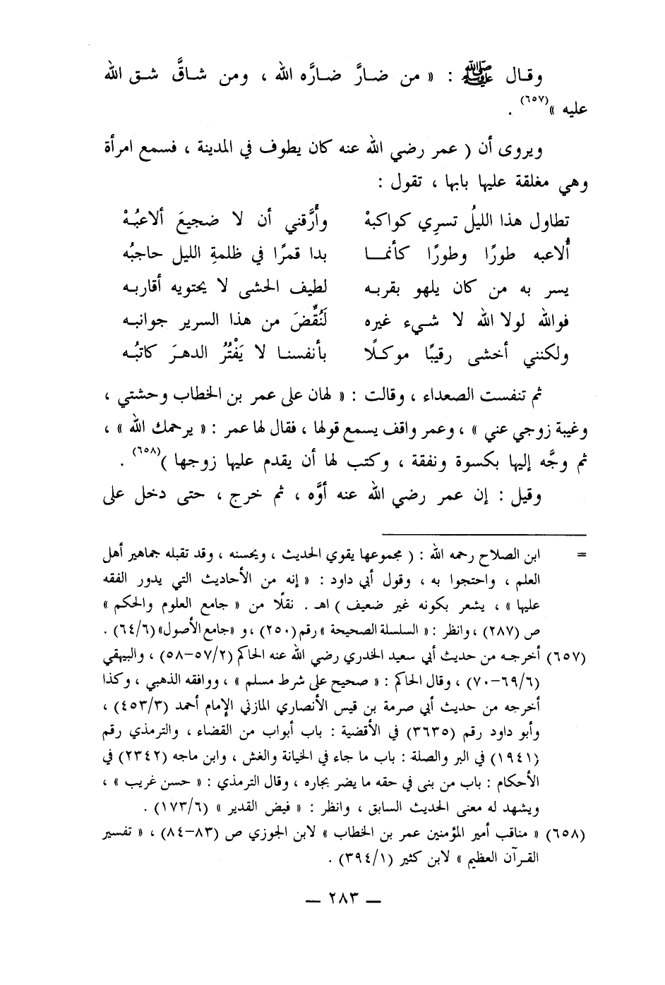 ويروى أن (عمر رضي الله عنه كان يطوف في المدينة، فسمع امرأة وهي مغلقة عليها بابها، تقول: