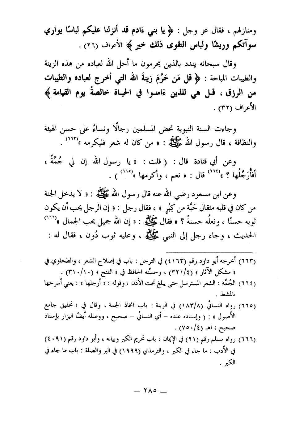 ومنازلهم، فقال عز وجل: (يا بني آدم قد أنزلنا عليكم لباسا يواري سوآتكم وريشا ولباس التقوى ذلك خير) الأعراف (26) . وقال سبحانه يندد بالذين يحرمون ما أحل الله لعباده من هذه الزينة والطيبات المباحة: (قُلْ مَنْ حَرَّمَ زِينَةَ اللَّهِ الَّتِي أَخْرَجَ لِعِبَادِهِ وَالطَّيِّبَاتِ مِنَ الرِّزْقِ قُلْ هِيَ لِلَّذِينَ آمَنُوا فِي الْحَيَاةِ الدُّنْيَا خَالِصَةً يَوْمَ الْقِيَامَةِ) [الأعراف: 32] .