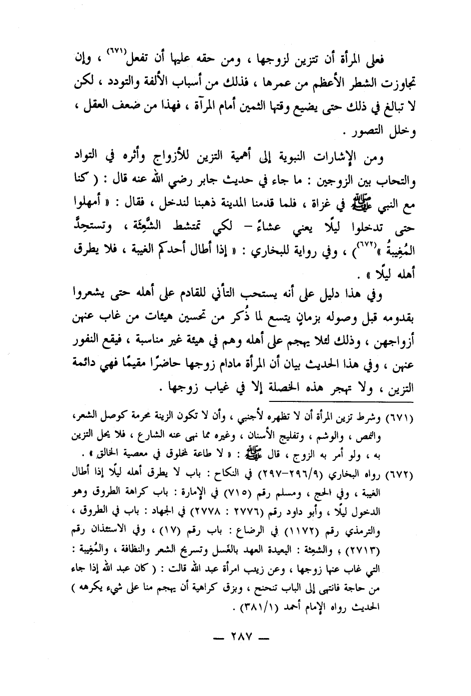 ومن الإشارات النبوية إلى أهمية التزين للأزواج وأثره في التواد والتحاب بين الزوجين: ما جاء في حديث جابر رضي الله عنه قال: (كنا مع النبي صلى الله عليه وسلم في غزاة، فلما قدمنا المدينة ذهبنا لندخل، فقال: (أمهلوا حتى تدخلوا ليلًا يعنى عشاء - لكي تمتشط الشعِثة، وتستحِد المُغِيبةُ " (672)) ، وفي رواية للبخاري: " إذا أطال أحدكم الغيبة، فلا يطرق أهله ليلا ".