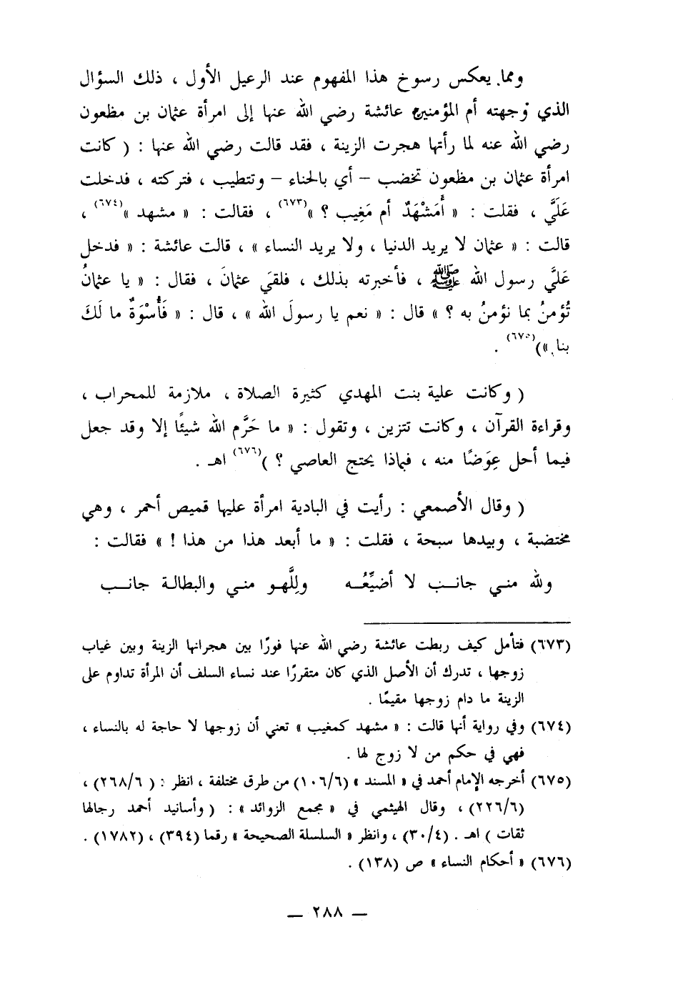 (673) فتأمل كيف ربطت عائشة رضي الله عنها فورا بين هجرانها الزينة وبين غياب زوجها، تدرك أن الأصل الذي كان متقررا عند نساء السلف أن المرأة تداوم على الزينة ما دام زوجها مقيما.