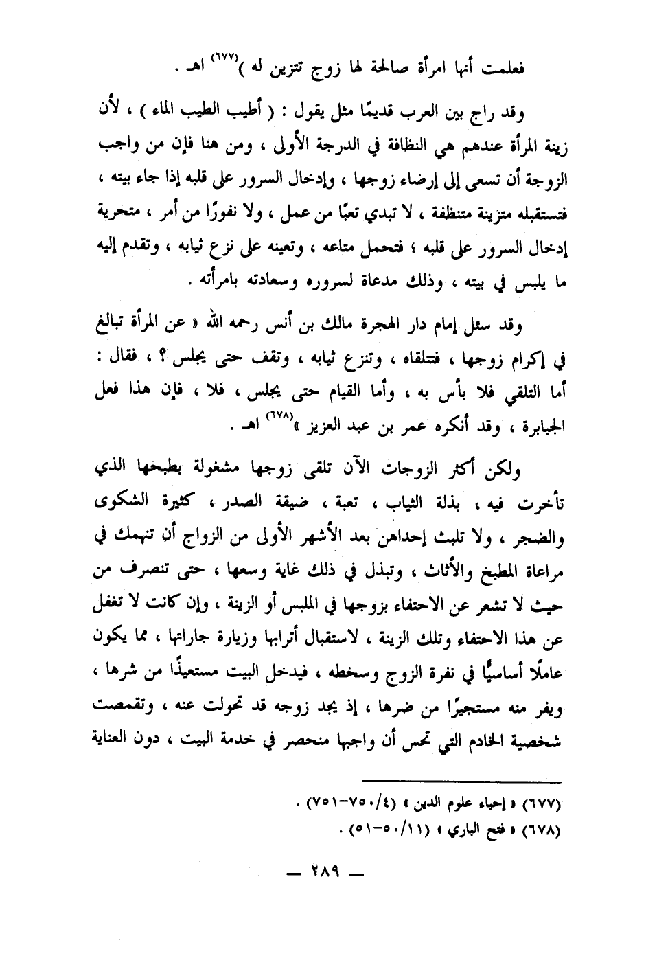 ولكن أكثر الزوجات الآن تلقى زوجها مشغولة بطبخها الذي تأخرت فيه، بذلة الثياب، تعبة، ضيقة الصدر، كثيرة الشكوى والضجر، ولا تلبث إحداهن بعد الأشهر الأولى من الزواج أن تنهمك في مراعاة المطبخ والأثاث، وتبذل في ذلك غاية وسعها، حتى تنصرف من حيث لا تشعر عن الاحتفاء بزوجها في الملبس أو الزينة، وإن كانت لا تغفل عن هذا الاحتفاء وتلك الزينة، لاستقبال أترابها وزيارة جاراتها، مما يكون عاملا أساسيا في نفرة الزوج وسخطه، فيدخل البيت مستعيذًا من شرها، ويفر منه مستجيرَا من ضرها، إذ يجد زوجه قد تحولت عنه، وتقمصت شخصية الخادم التي تحس أن واجبها منحصر في خدمة البيت، دون العناية