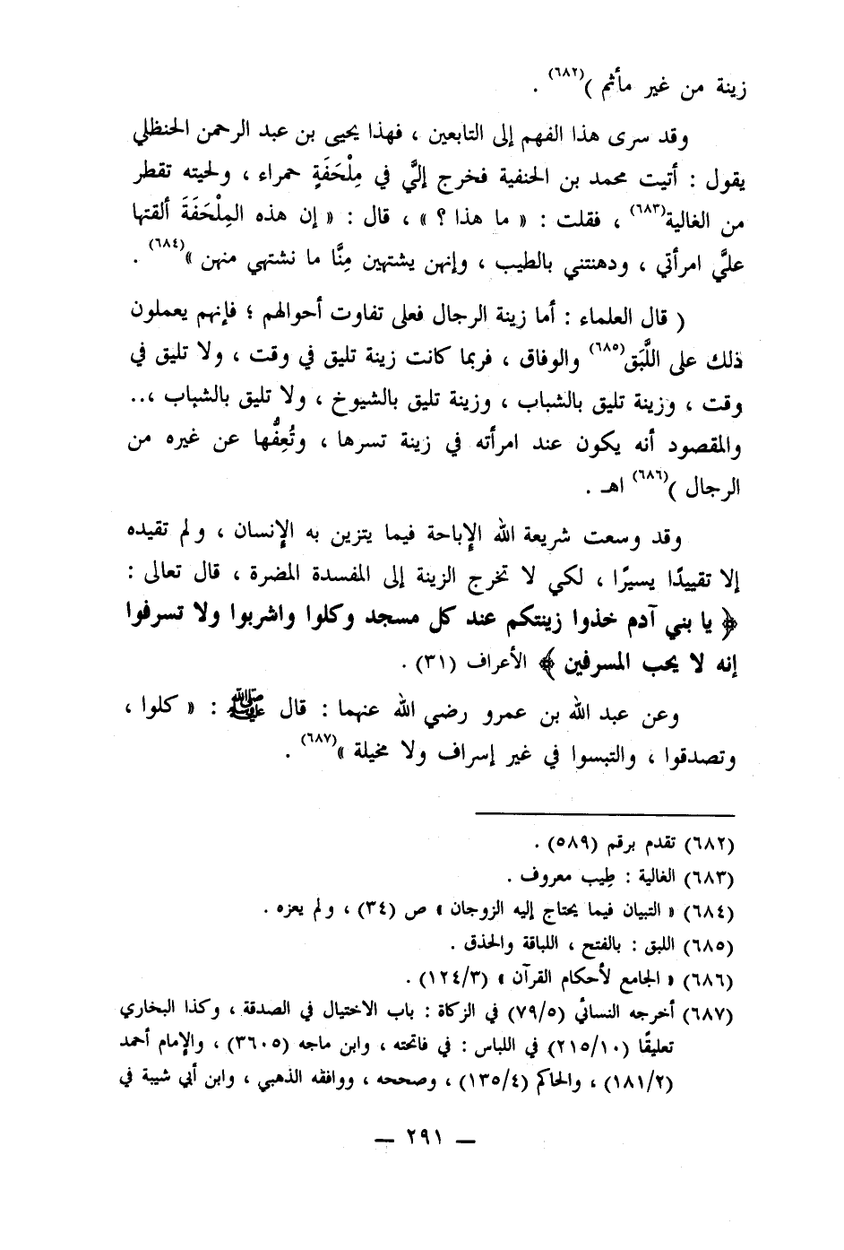 وقد سرى هذا الفهم إلى التابعين، فهذا يحيى بن عبد الرحمن الحنظلي يقول: أتيت محمد بن الحنفية فخرج إليَّ في مِلْحَفَةٍ حمراء، ولحيته تقطر من الغالية (683) ، فقلت: " ما هذا؟ "، قال: " إن هذه المِلْحَفَةَ ألقتها علي امرأتي، ودهنتني بالطيب، وإنهن يشتهين مِنا ما نشتهي منهن " (684) .