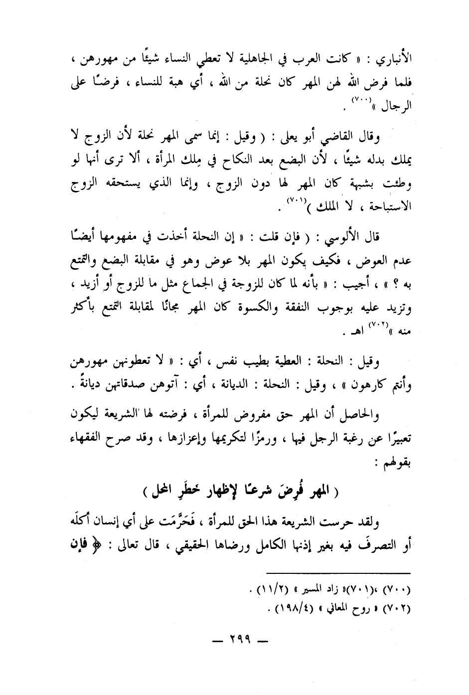 الأنباري: " كانت العرب في الجاهلية لا تعطي النساء شيئًا من مهورهن، فلما فرض الله لهن المهر كان نحلة من الله، أي هبة للنساء، فرضًا على الرجال " (700) .