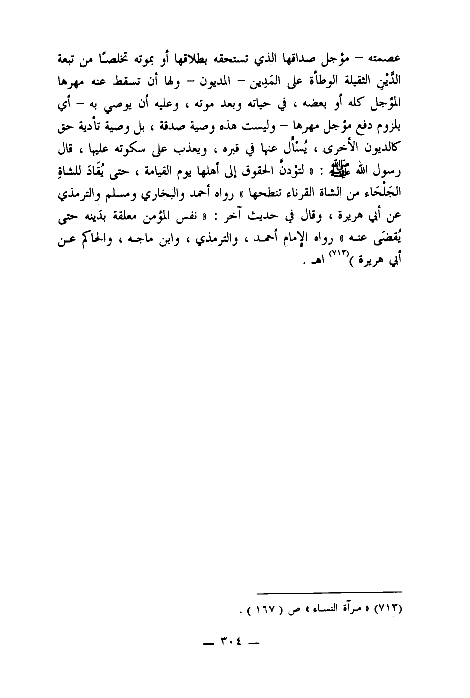 عصمته - مؤجل صداقها الذي تستحقه بطلاقها أو بموته تخلصا من تبعة الدينِ الثقيلة الوطأة على المَدِين - المديون- ولها أن تسقط عنه مهرها المؤجل كله أو بعضه، في حياته وبعد موته، وعليه أن يوصي به- أي بلزوم دفع مؤجل مهرها - وليست هذه وصية صدقة، بل وصية تأدية حق كالديون الأخرى، يسْأل عنها في قبره، ويعذب على سكوته عليها، قال رسول الله صلى الله عليه وسلم: " لتؤدن الحقوق إلى أهلها يوم القيامة، حتى يُقادَ للشاةِ الجَلْحَاء من الشاة القرناء تنطحها، رواه أحمد والبخاري ومسلم والترمذي عن أبي هريرة، وقال في حديث آخر: (نفس المؤمن معلقة بدَينه حتى يُقضَى عنه، رواه الإمام أحمد، والترمذي، وابن ماجه، والحاكم عن أبي هريرة) (713) اهـ.