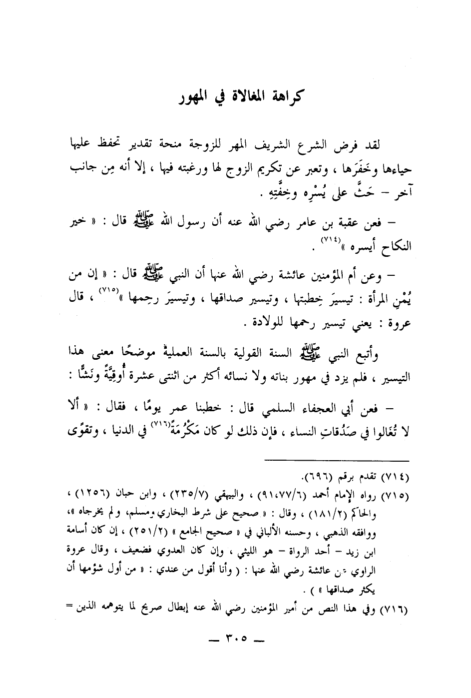 - فعن عقبة بن عامر رضي الله عنه أن رسول الله صلى الله عليه وسلم قال: " خير النكاح أيسره " (714) .
