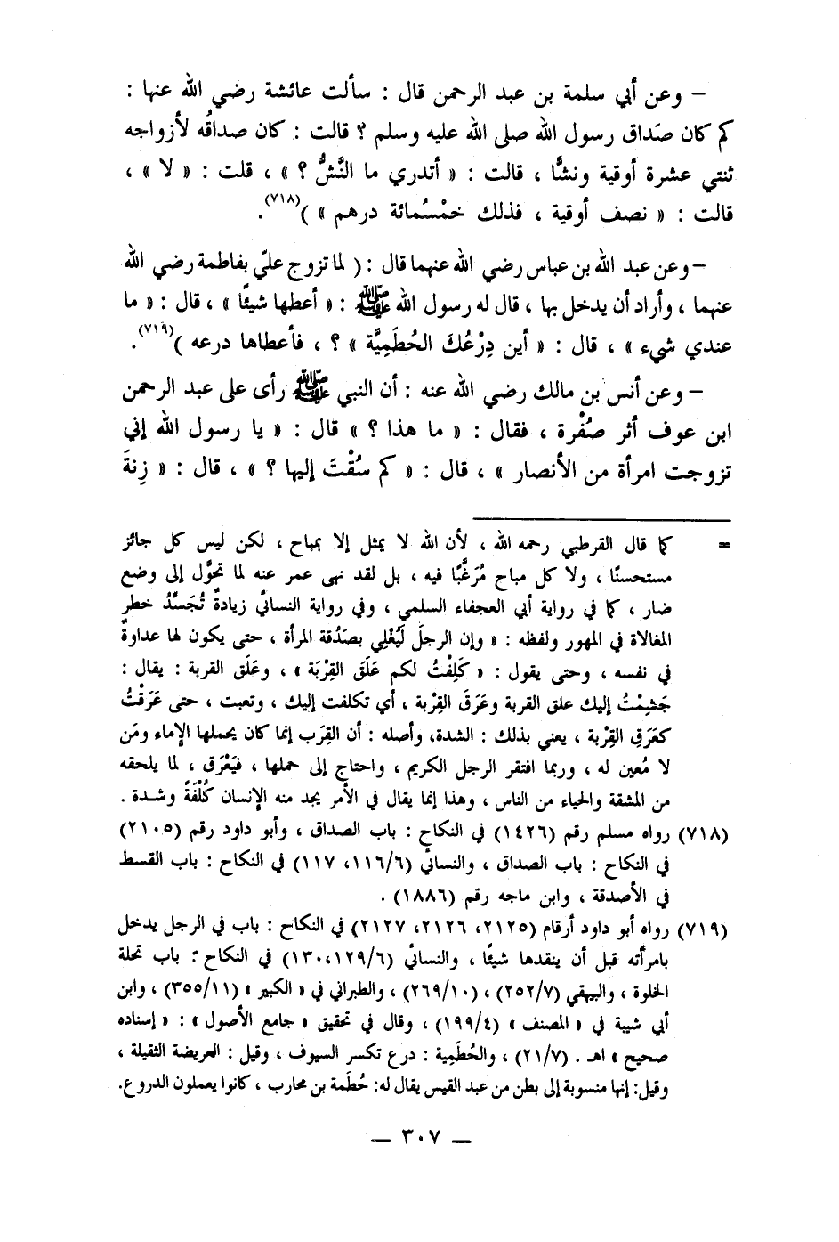 - وعن أنس بن مالك رضي الله عنه: أن النبي صلى الله عليه وسلم رأى على عبد الرحمن ابن عوف أثر صُفرة، فقال: " ما هذا؟ " قال: " يا رسول الله إني تزوجت امرأة من الأنصار "، قال: " كم سُقْتَ إليها؟ "، قال: " زِنةَ