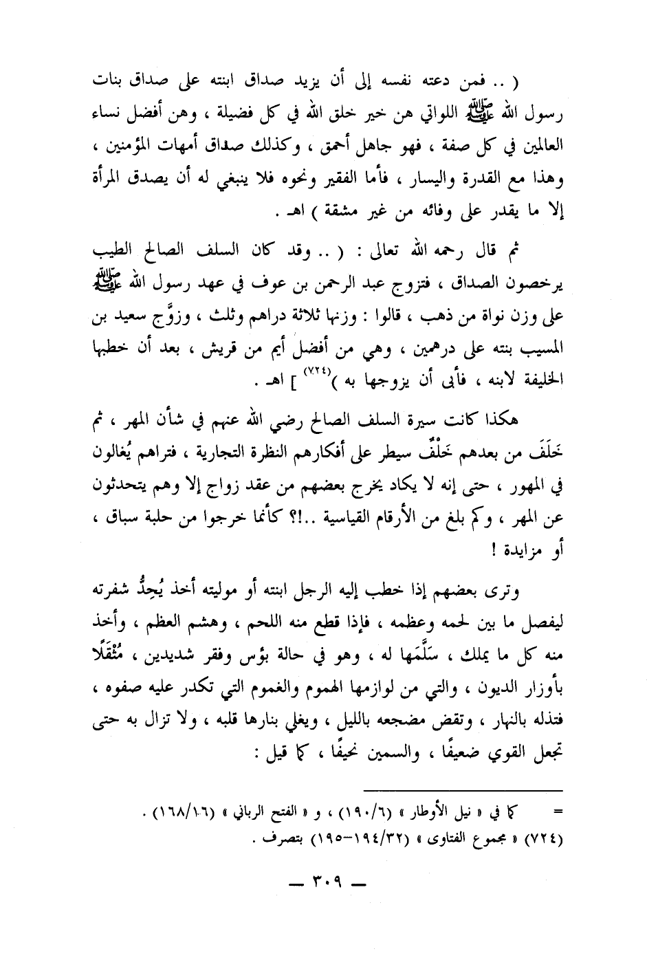 ثم قال رحمه الله تعالى: (.. وقد كان السلف الصالح الطيب يرخصون الصداق، فتزوج عبد الرحمن بن عوف في عهد رسول الله صلى الله عليه وسلم على وزن نواة من ذهب، قالوا: وزنها ثلاثة دراهم وثلث، وزوج سعيد بن المسيب بنته على درهمين، وهي من أفضل أيم من قريش، بعد أن خطبها الخليفة لابنه، فأبى أن يزوجها به) (724) ] اهـ.