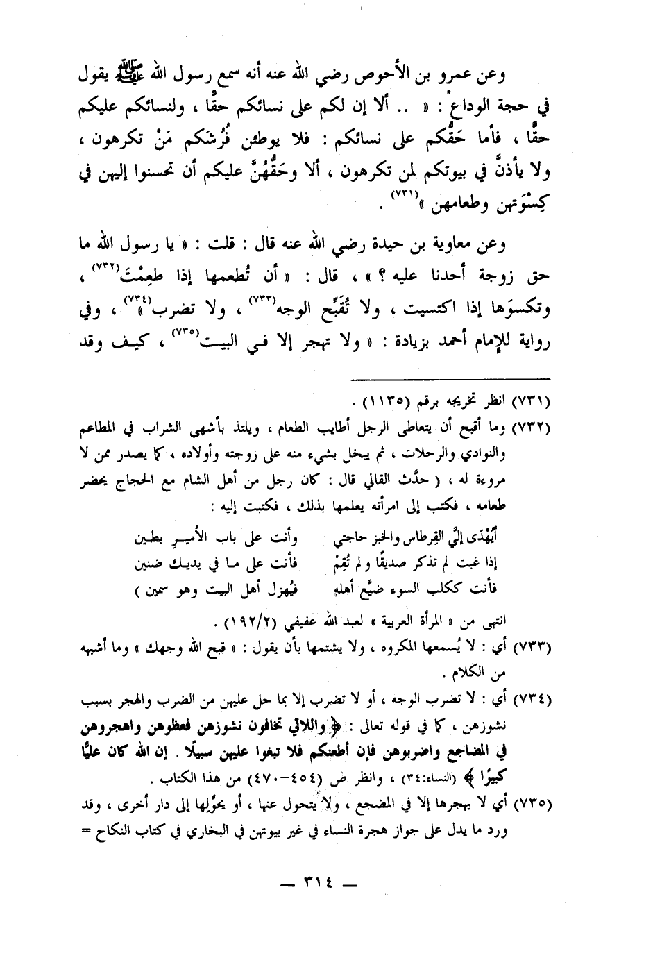 (734) أي: لا تضرب الوجه، أو لا تضرب إلا بما حل عليهن من الضرب والهجر بسبب نشوزهن، كما في قوله تعالى: (واللاتي تخافون نشوزهن فعظوهن واهجروهن في المضاجع واضربوهن فإن أطعنكم فلا تبغوا عليهن سبيلًا. إن الله كان عليا كبيرا) (النساء: 34) ، وانظر ص (454 - 470) من هذا الكتاب.