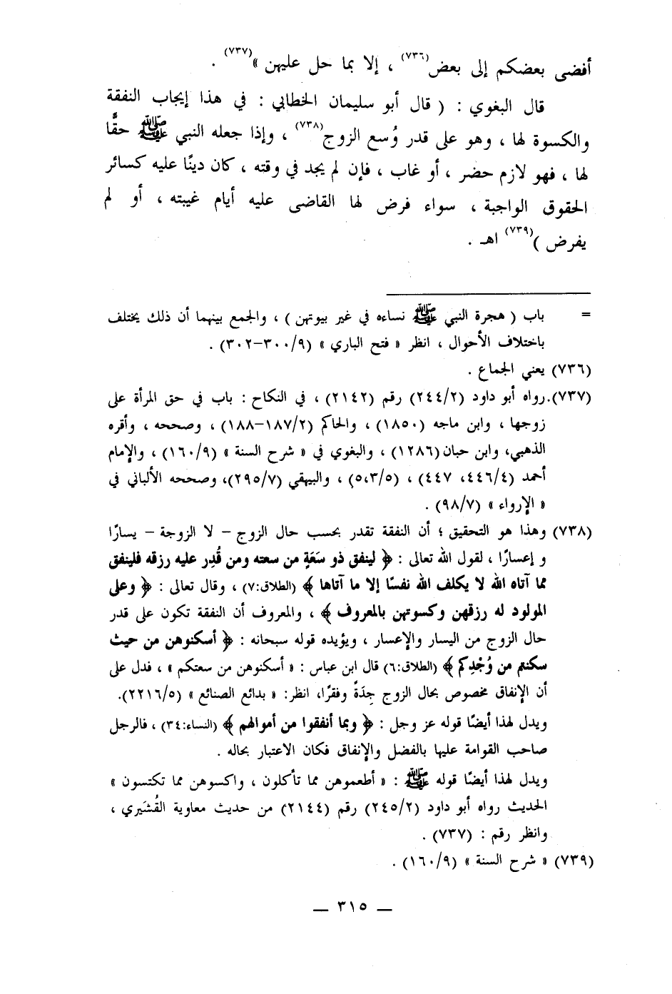 (738) وهذا هو التحقيق؛ أن النفقة تقدر بحسب حال الزوج - لا الزوجة - يسارًا وإعسارا، لقول الله تعالى: (لينفق ذو سعة من سعته ومن قُدِر عليه رزقه فينفق مما آتاه الله لا يكلف الله نفسا إلا ما آتاها) (الطلاق: 7) ، وقال تعالى: (وعلى المولود له رزقهن وكسوتهن بالمعروف) ، والمعروف أن النفقة تكون على قدر حال الزوج من اليسار والإعسار، ويؤيده قوله سبحانه: (أسكنوهن من حيث سكنتم من وُجدِكم) (الطلاق: 6) قال ابن عباس: " أسكنوهن من سعتكم"، فدل على أن الإنفاق مخصوص بحال الزوج جِدَة وفقرا، انظر: " بدائع الصنائع" (5/2216) .