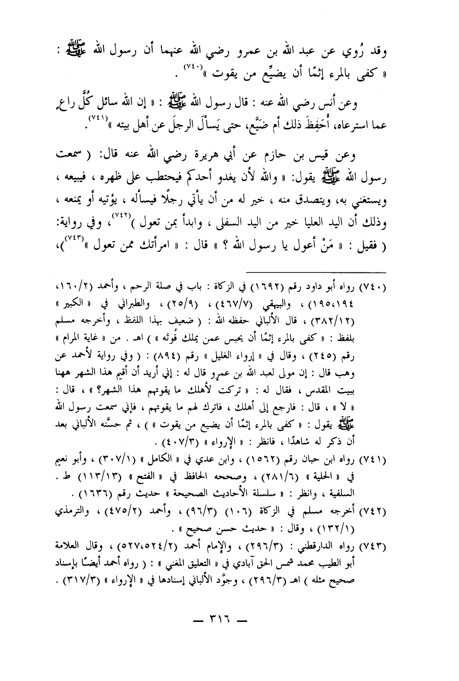 (740) رواه أبو داود رقم (1692) في الزكاة: باب في صلة الرحم، وأحمد (2/160، 194، 195) ، والبيهقي (7/467) ، (9/25) ، والطبراني في " الكبير" (12/382) ، قال الألباني حفظه الله: (ضعيف بهذا اللفظ، وأخرجه مسلم بلفظ: " كفى بالمرء إثما أن يحبس عمن يملك قوتَه ") اهـ. من " غاية المرام" رقم (245) ، وقال في " إرواء الغليل " رقم (894) : (وفي رواية لأحمد عن وهب قال: إن مولى لعبد الله بن عمرو قال له: (إني أريد أن أقيم هذا الشهر ههنا ببيت المقدس، فقال له: (تركت لأهلك ما يقوتهم هذا الشهر؟ "، قال: "لا"، قال: فارجع إلى أهلك، فاترك لهم ما يقوتهم، فإني سمعت رسول الله صلى الله عليه وسلم يقول: " كفى بالمرء إثما أن يضيع من يقوت ") ، ثم حسنه الألباني بعد أن ذكر له شاهدًا، فانظر: " الإرواء" (3/407) .
