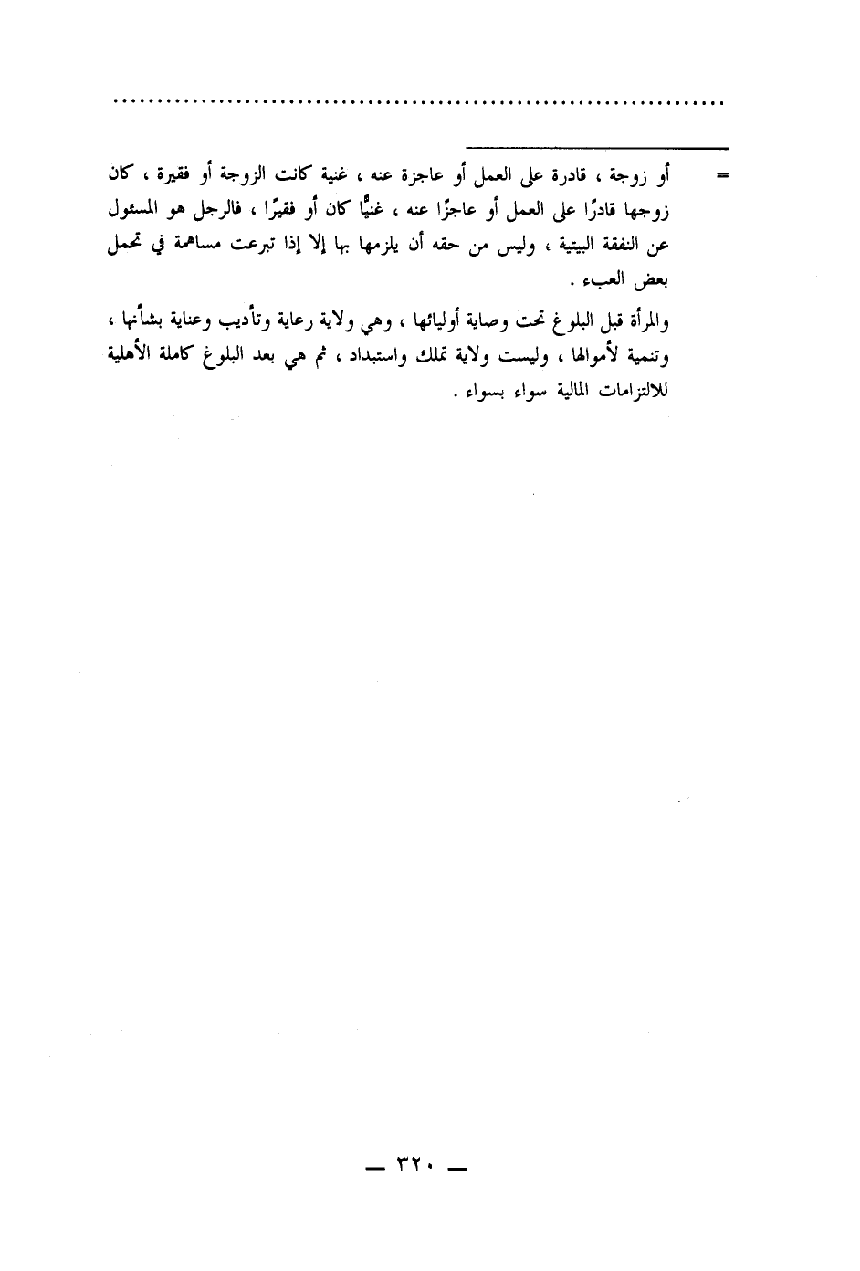 = أو زوجة، قادرة على العمل أو عاجزة عنه، غنية كانت الزوجة أو ففيرة، كان زوجها قادرا على العمل أو عاجزًا عنه، غنيا كان أو فقيرا، فالرجل هو المسئول عن النفقة البيتية، وليس من حقه أن يلزمها بها إلا إذا تبرعت مساهمة في تحمل بعض العبء.