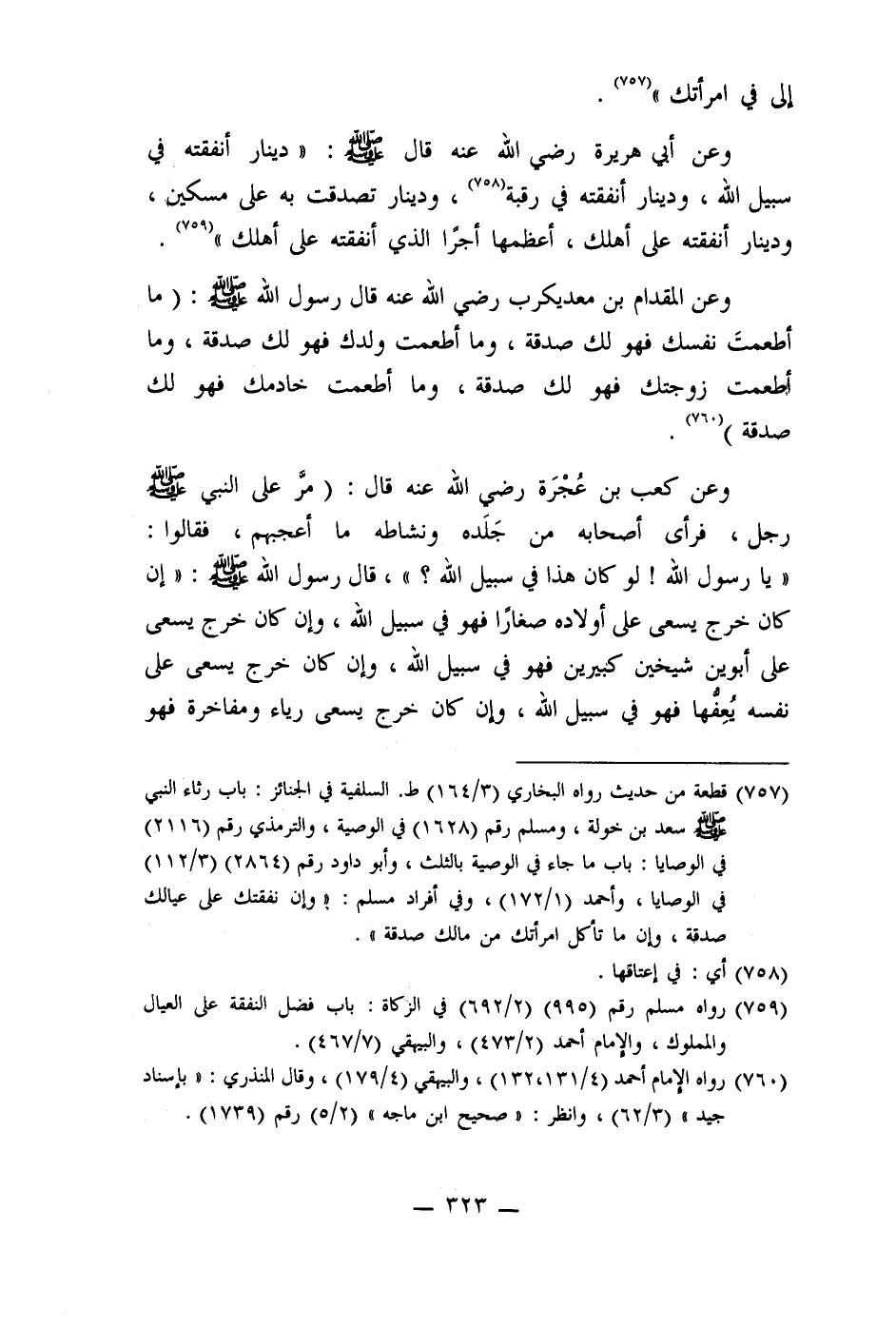 وعن أبي هريرة رضي الله عنه قال صلى الله عليه وسلم: " دينار أنفقته في سبيل الله، ودينار أنفقته في رقبة (758) ، ودينار تصدقت به على مسكين، ودينار أنفقته على أهلك، أعظمها أجرَا الذي أنفقته على أهلك " (759) .